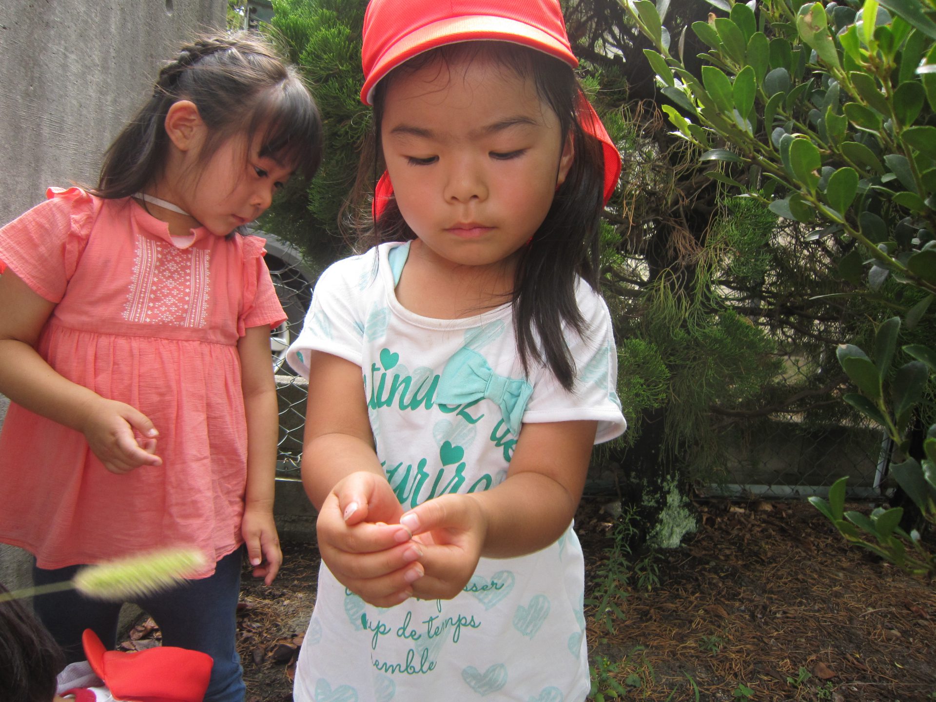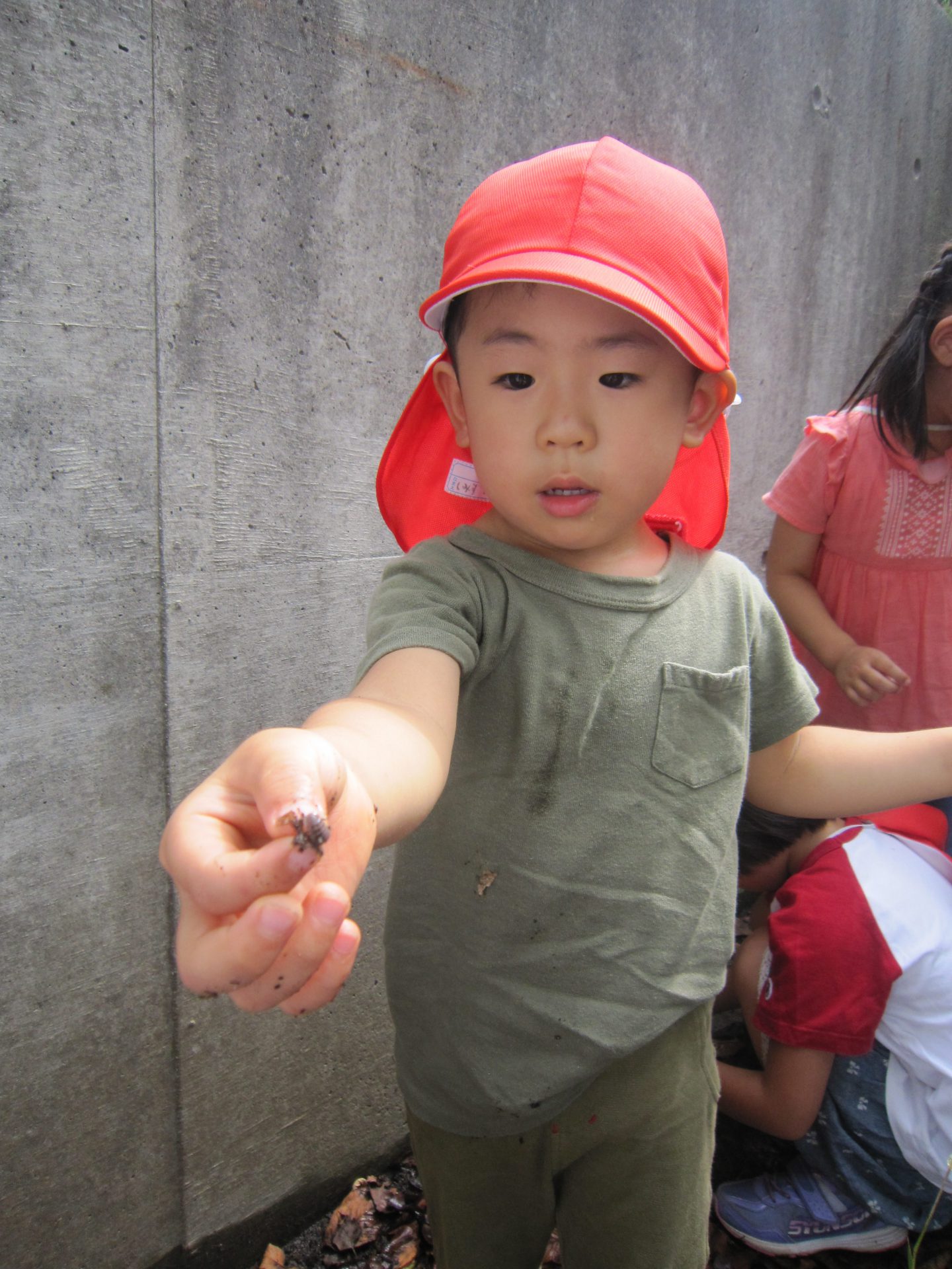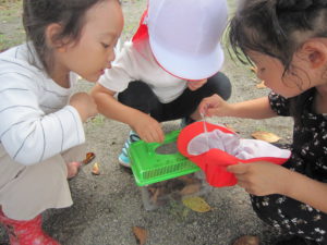 「おだんごむしさん」と言って大切に扱う年中組の子ども達。そんな様子を見て年少組の子どもたちも興味を示し、一緒に探したり見つけてもらいダンゴムシに触れることができました。
