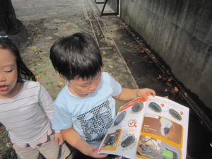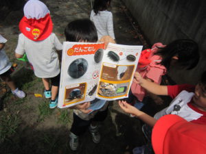 春に子どもたちが夢中になっていた”ダンゴムシ”夏になり姿をあまり見なくなっていましたが、どうやらまた幼稚園にやってきてくれたようです。前日の雨で湿った落ち葉の下にいたのを見つけ、「僕も!」「私も!」とダンゴムシ探しが始まりました。お部屋にあった図鑑を持ち出しどこにいるのかを見ながら捜索開始!