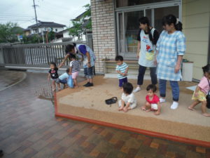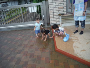 カッパ運動会を見ていた未満児クラスの子どもたちも 手でピチャピチャ 足でパシャパシャ。
