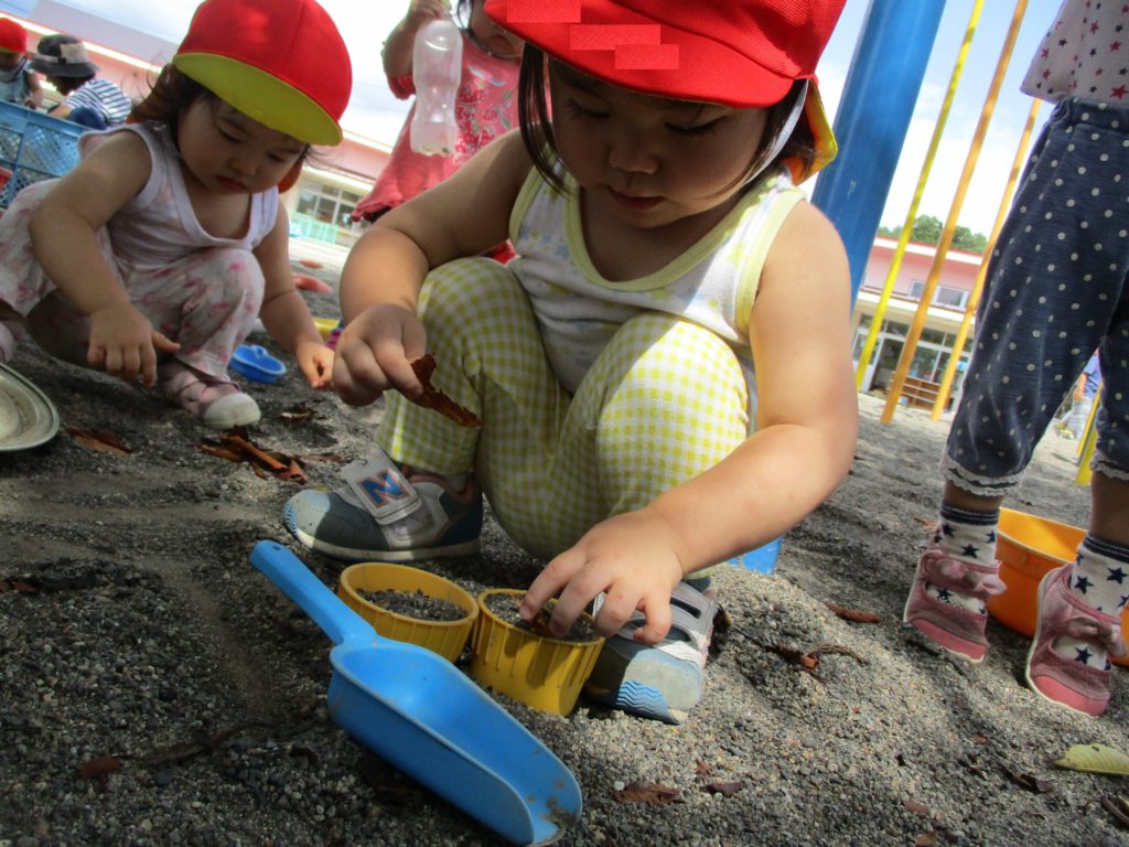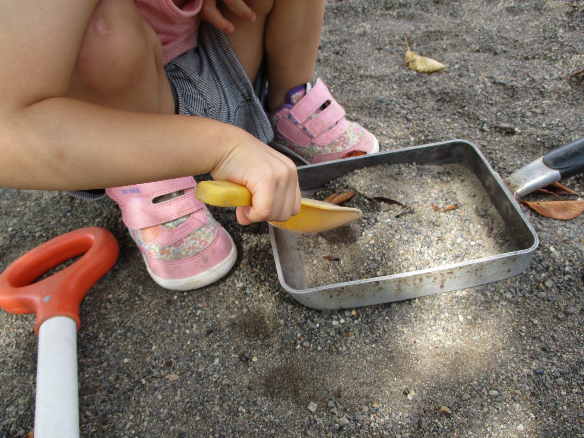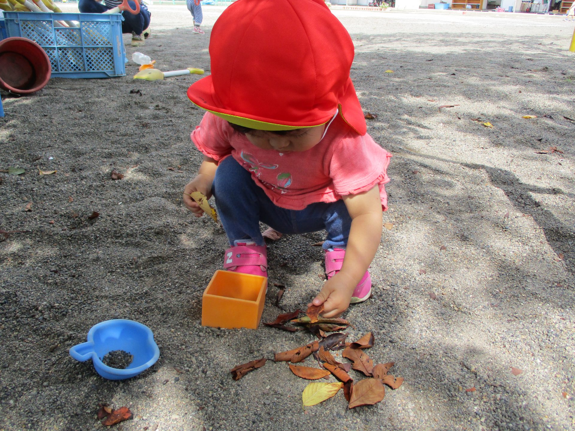 そのそばで遊んでいたお友達は、スコップで砂と一緒に葉っぱもすくっています。