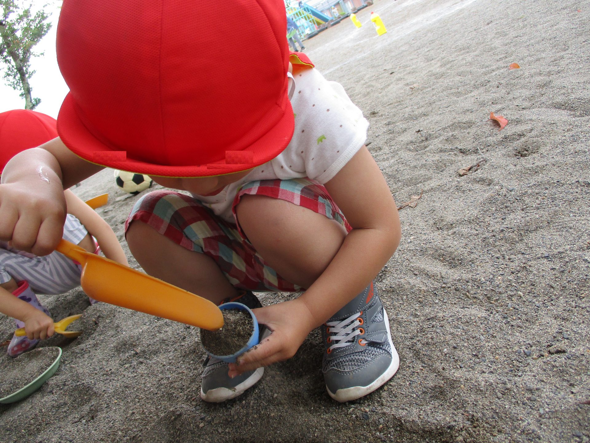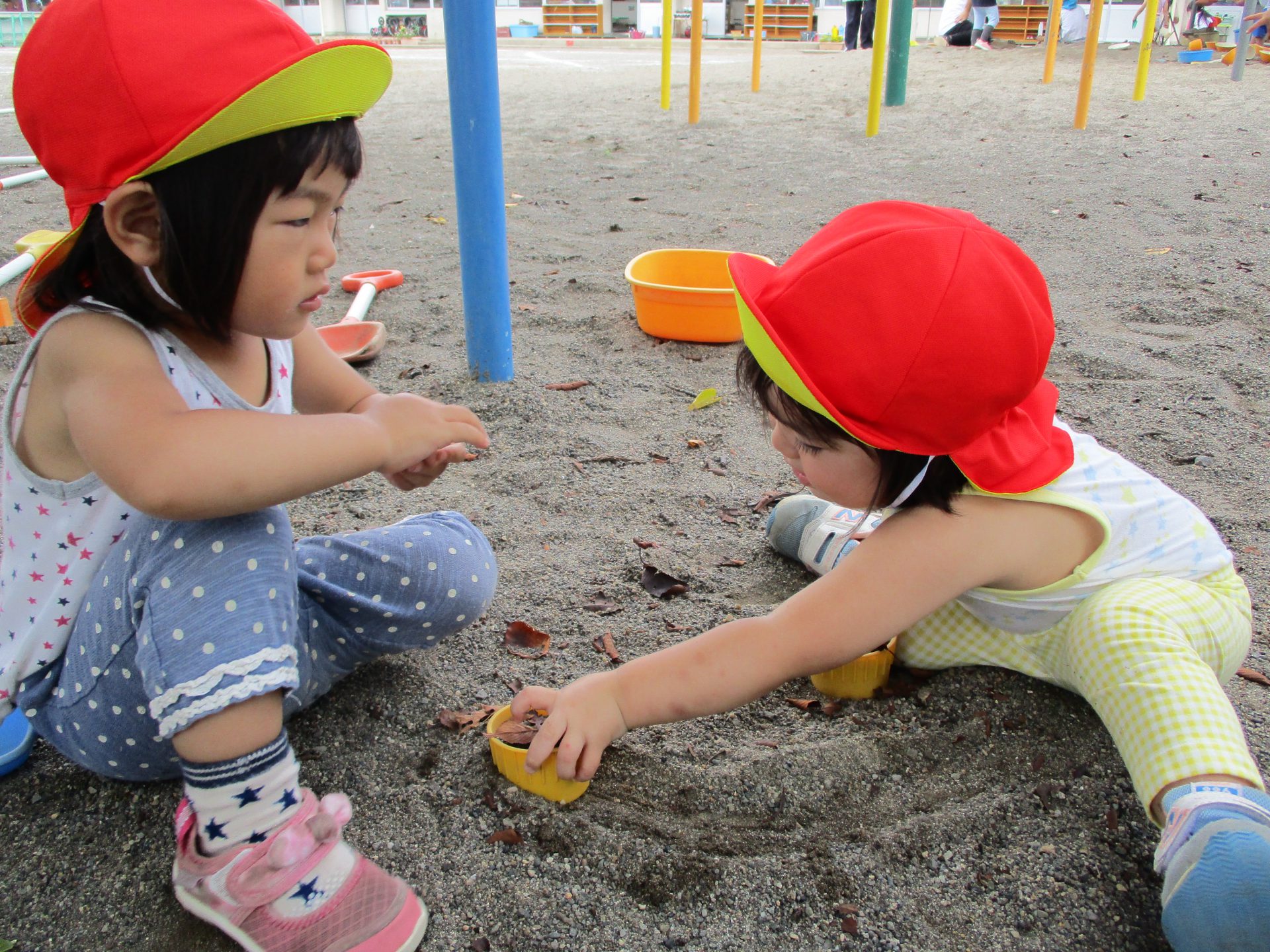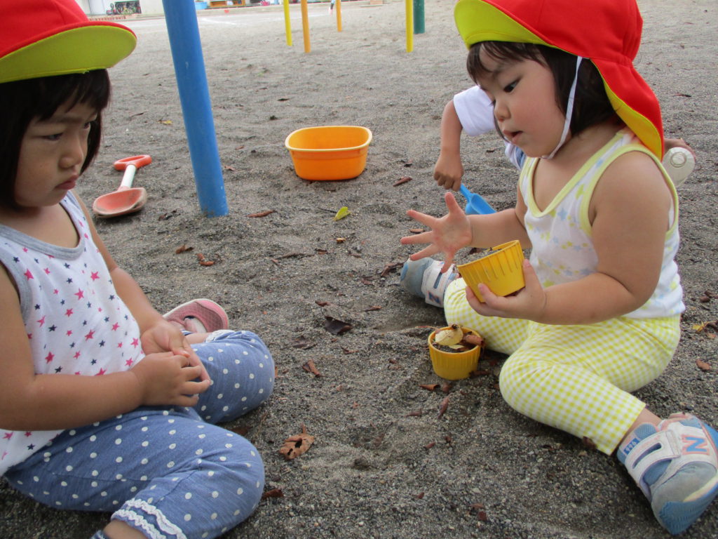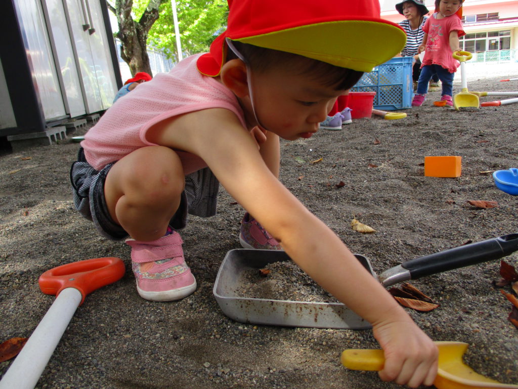 そのそばで遊んでいたお友達は、スコップで砂と一緒に葉っぱもすくっています。