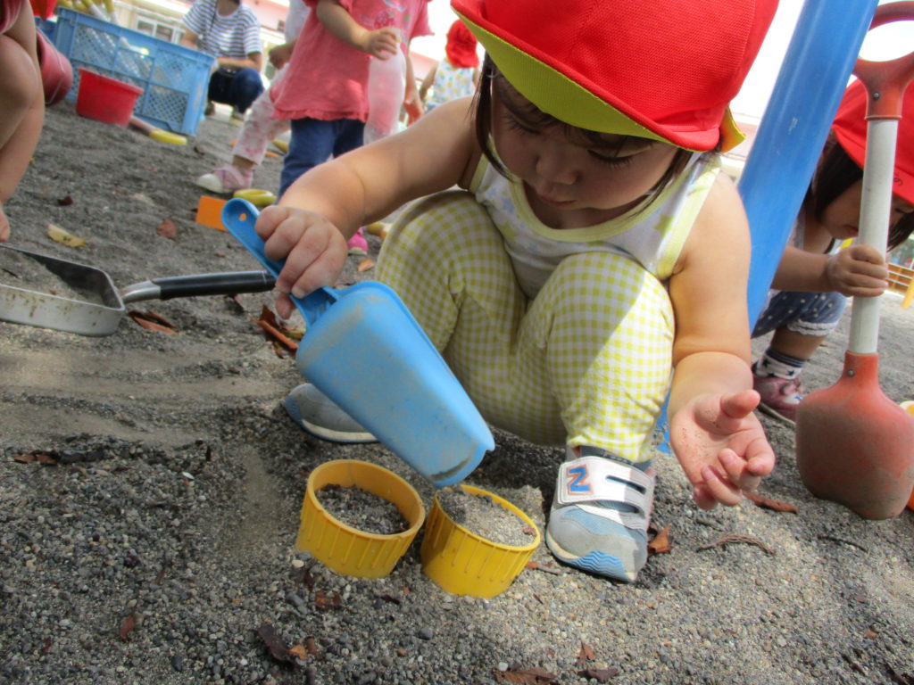 砂場では、お皿をいくつも並べてスコップで砂を入れているお友達がいました。