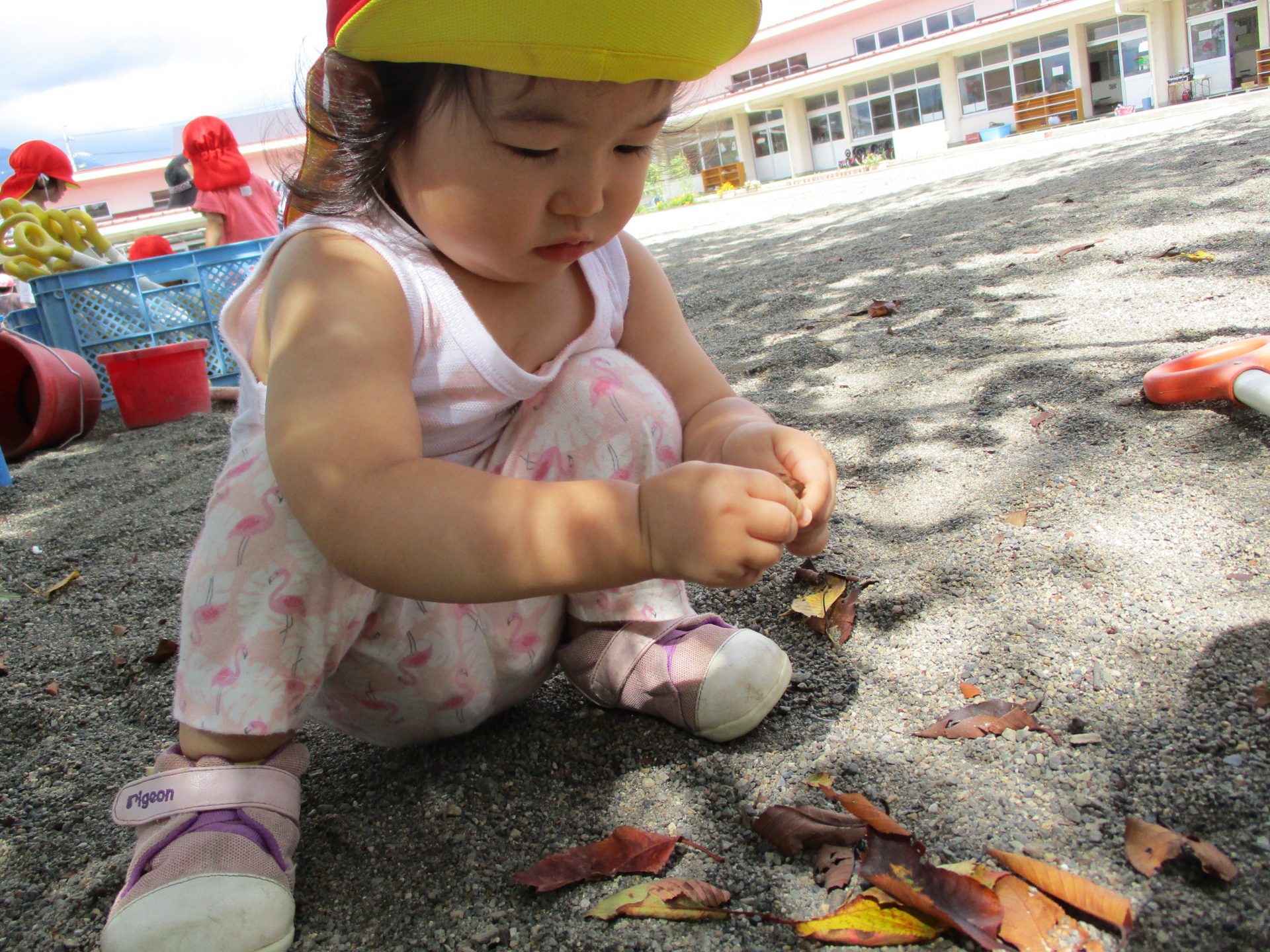葉っぱやありなど、秋の自然に興味を示していた1歳児さん。戸外遊びや散歩を通して、落ち葉や木の実を触ったり、拾ったり、匂いをかいだと、保育者や友だちと一緒に秋の自然に親しめるようにしていきたいです。