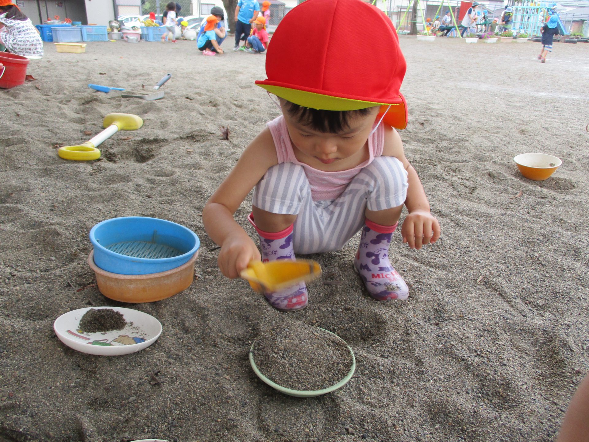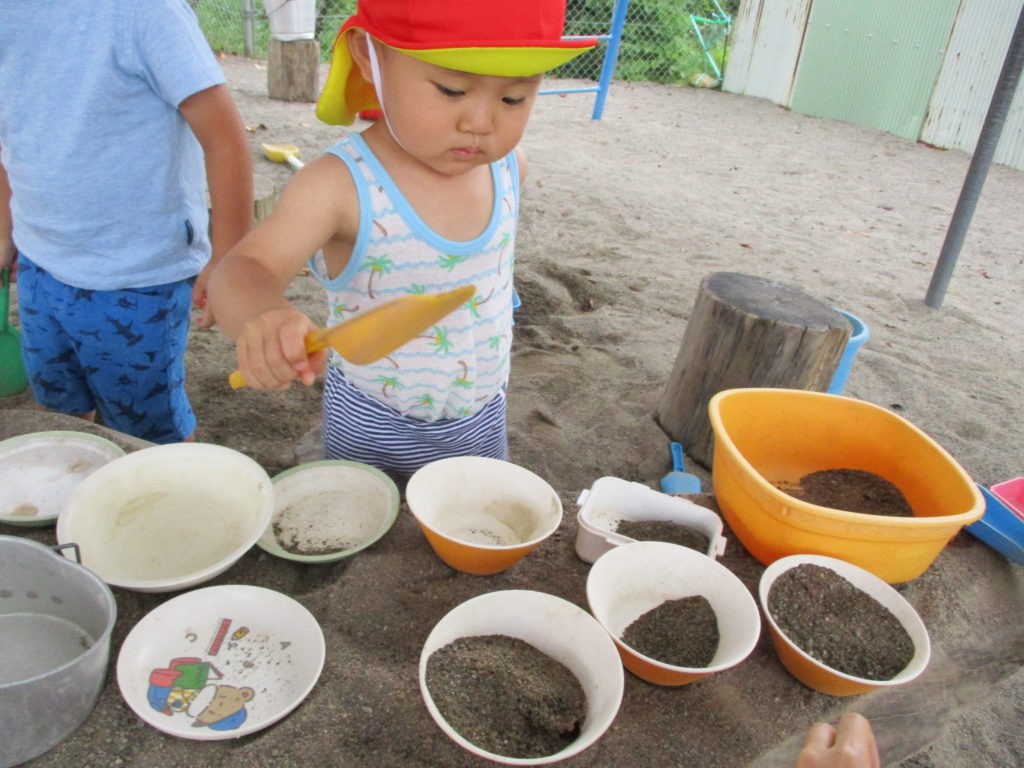 こちらのお友達は、並べたお皿ひとつづつに砂を入れていました。
