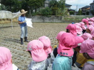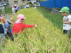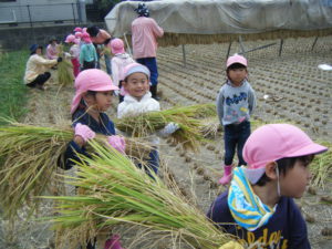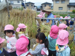 ・貴重な体験をさせて頂いている近所の佐々木さんにはたくさんの事を教えていただいています。春に植えた早苗からたくさんのお米がとれたこと、しっかりご飯を食べて大きくなってほしいということ、お米一粒もこうやって大事に作られていること、子ども達は真剣に聞いていました。保育園だけでは体験できないことをさせてくれる近所の方に感謝の気持ちを持ってほしいと思います。