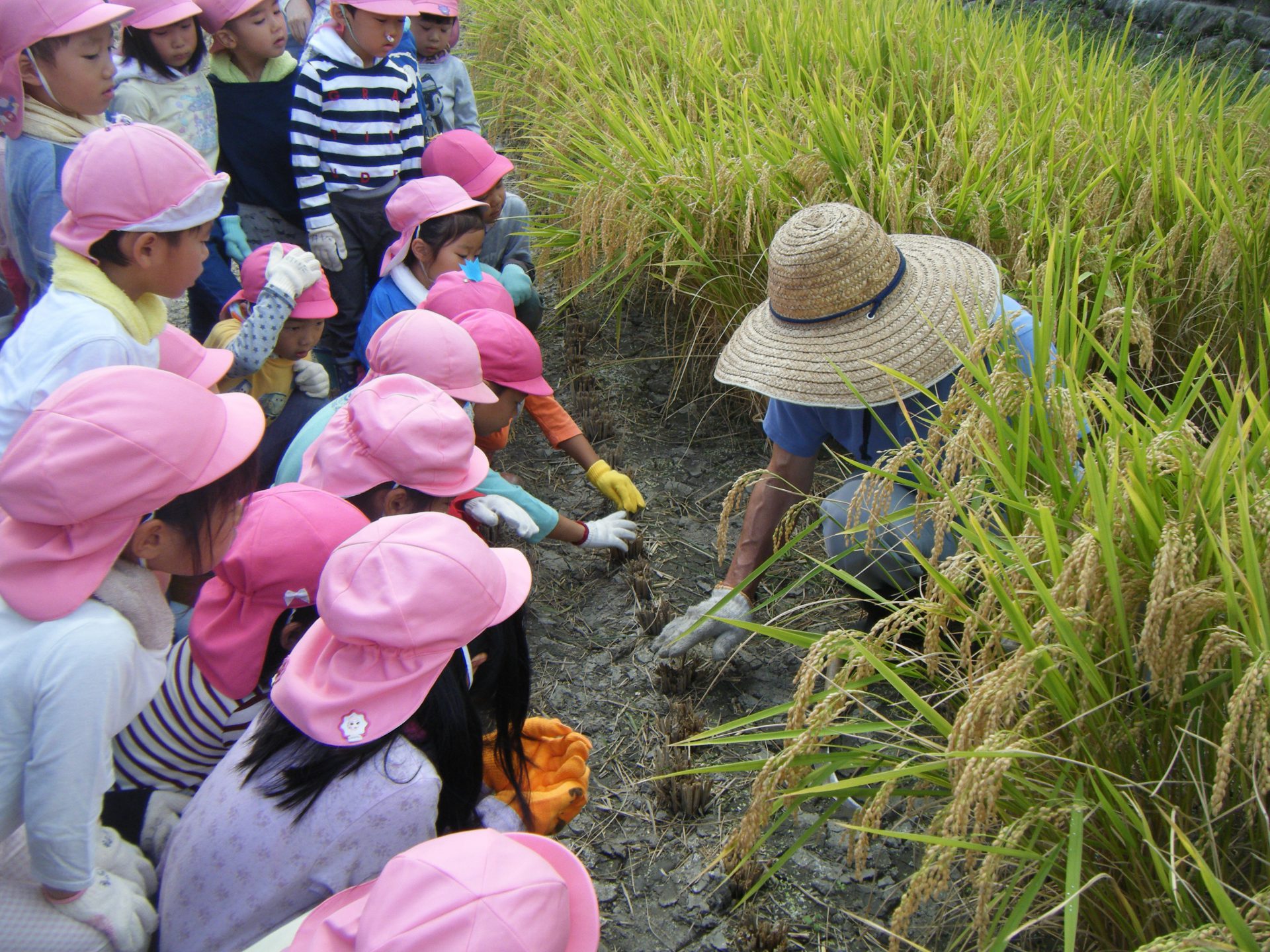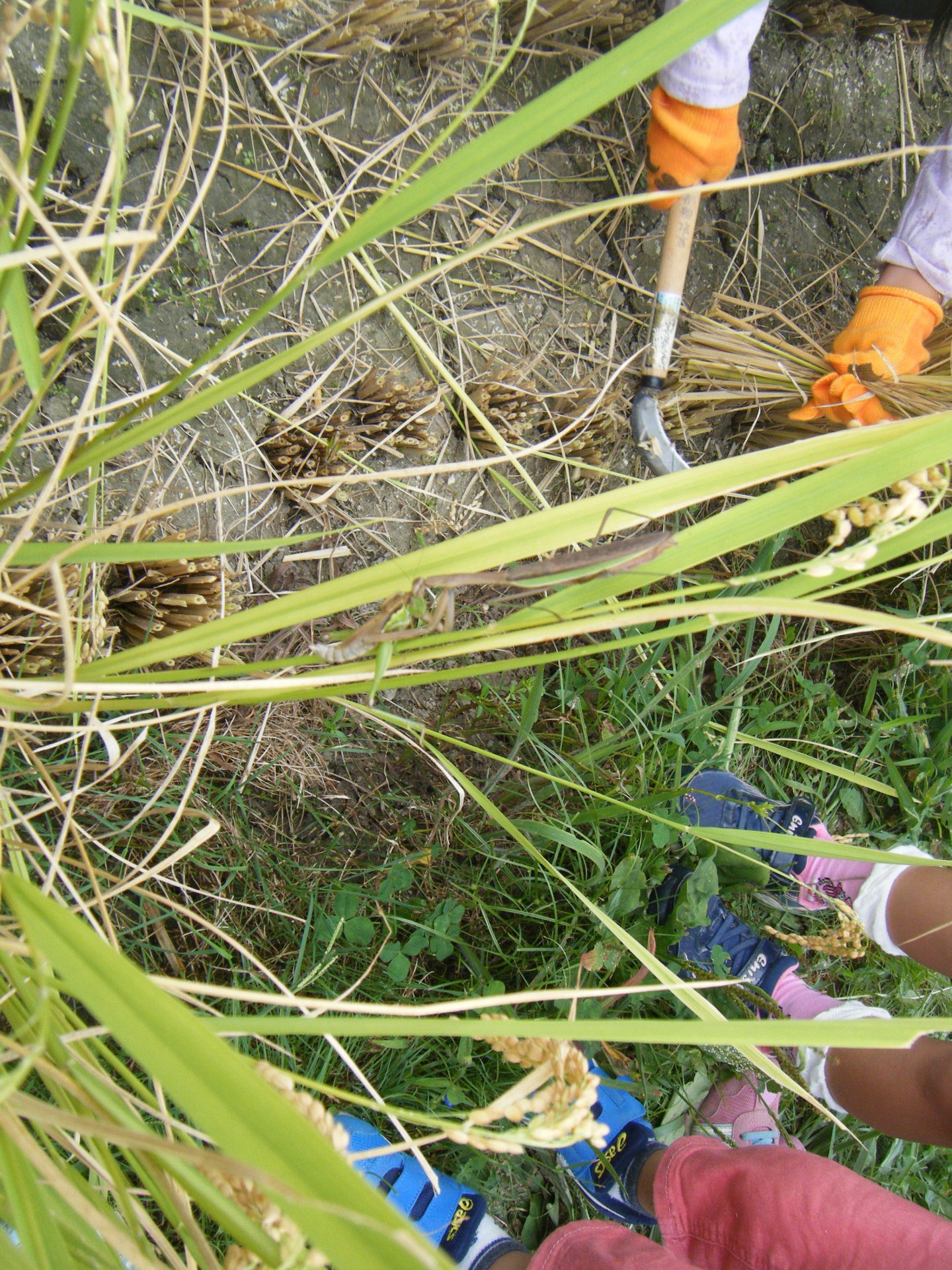 ・偶然、であった自然界の残酷なシーン。でも、みんな命を頂いて生きているんだと思います。はじめはイナゴに逃げて!と助けようとしていた子もいましたが、カマキリも生きていくためにイナゴを食べるんだという事を感じ様子をじっと見ていました。稲刈りを終えて佐々木さんが、はざにスズメ除けのネットを張りながら、「全部食べられると困るけど、スズメも生きていかなくてはならないから少しは食べられても仕方ないんだよ。みんな一緒に生きているからね」というお話をしてくださいました。子どもたちは納得して聞いていたと思います。