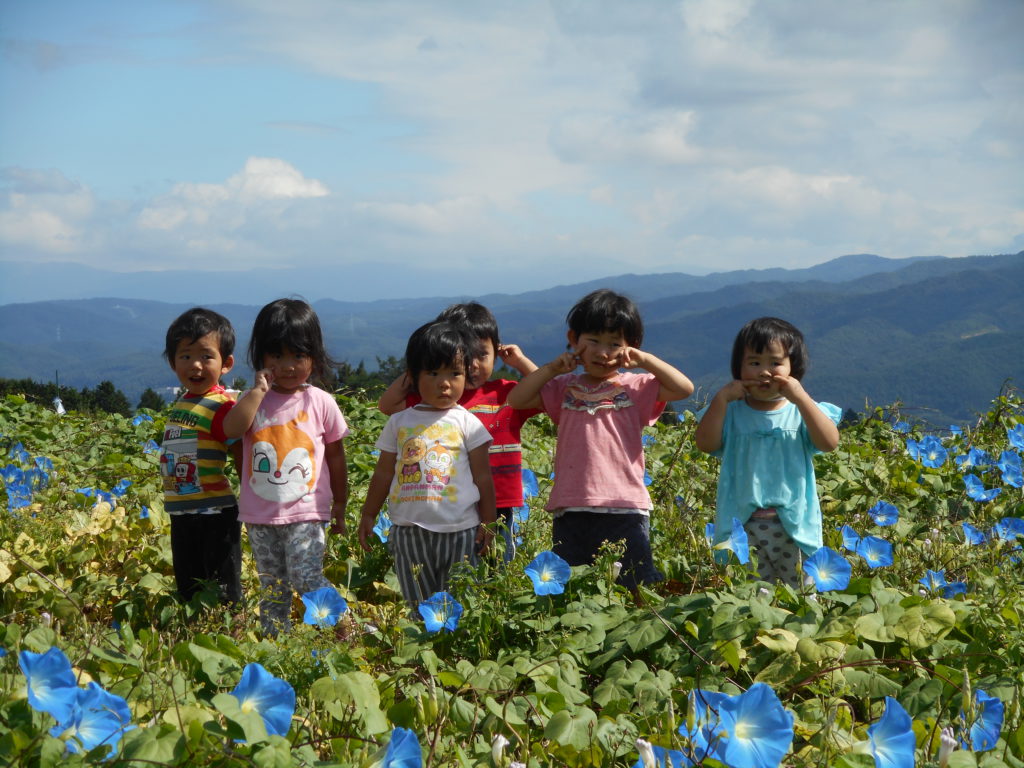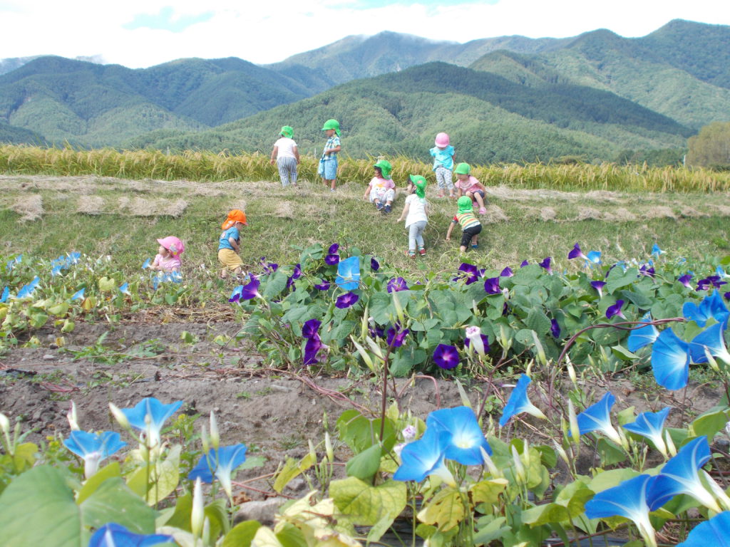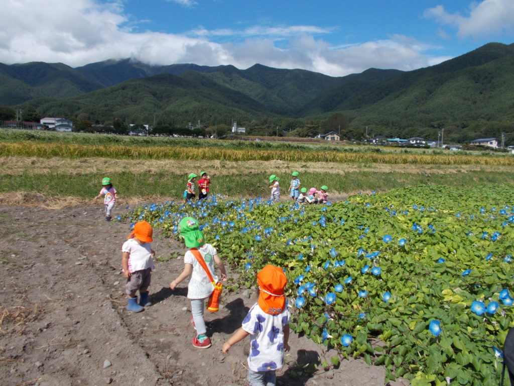 未満児の年齢でも歩ける散歩コースには様々なきれいな花が咲きます。青空の下で咲く花を見たり、戸外で思い切り身体を動かして遊びたいと思います。