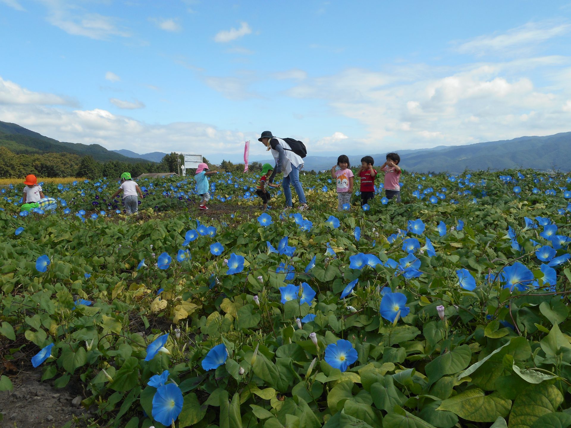 わ~きれいにさいているね!とアサガオの周りで大喜び。