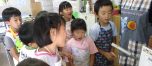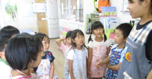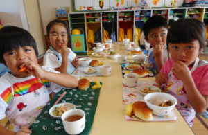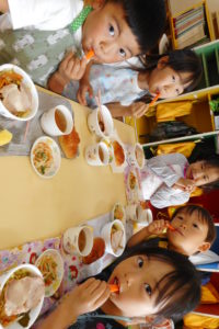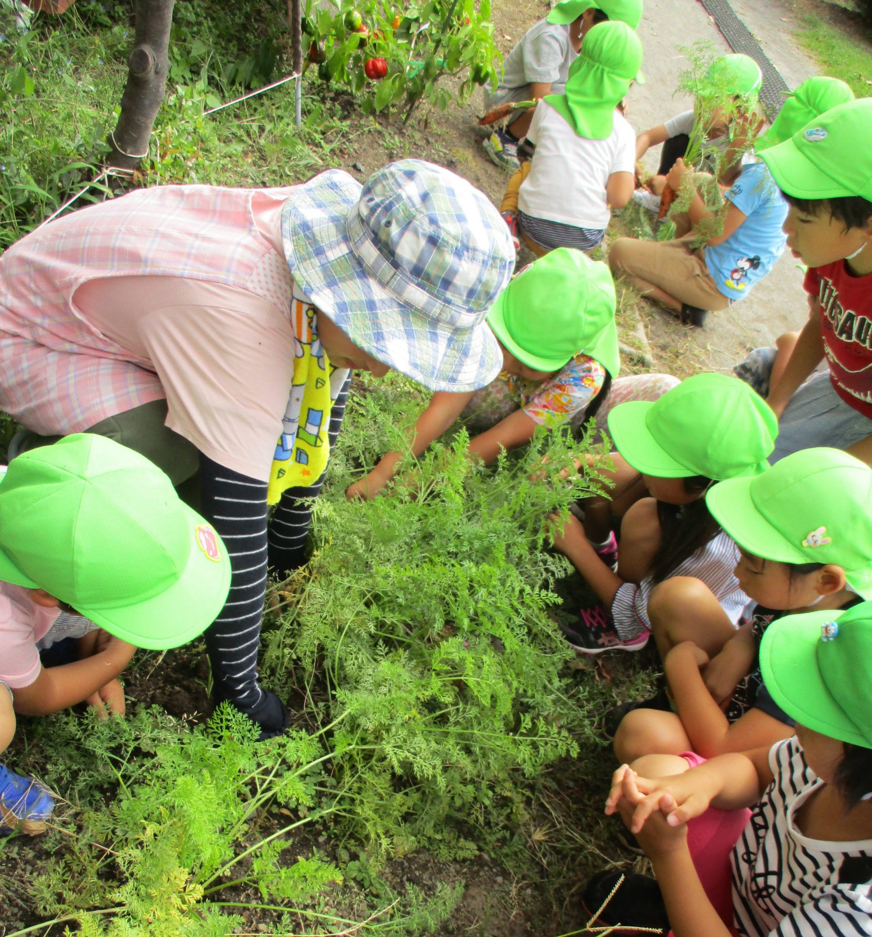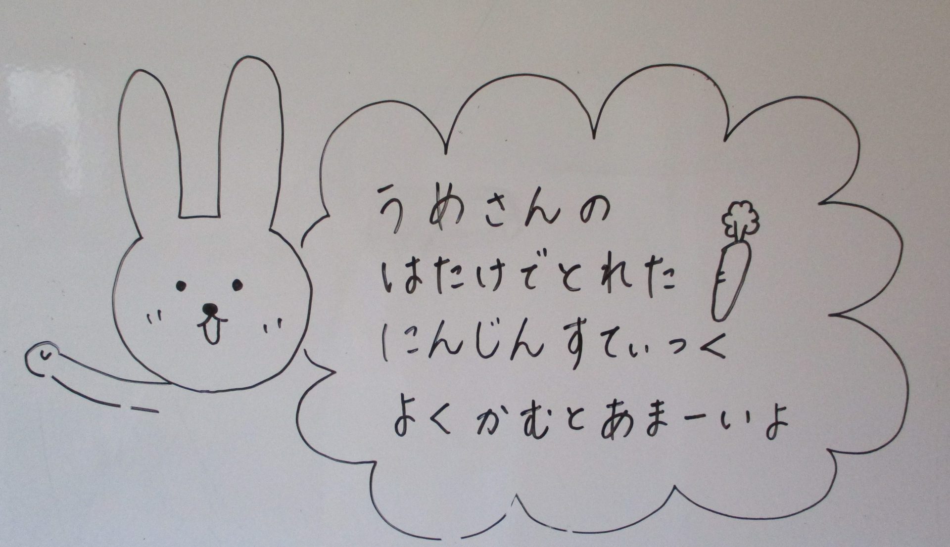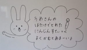 「うめ組からの、お知らせです。今日の人参スティックは、畑で採れた人参です。よく噛んで食べると甘いよ。いっぱい食べてください。」