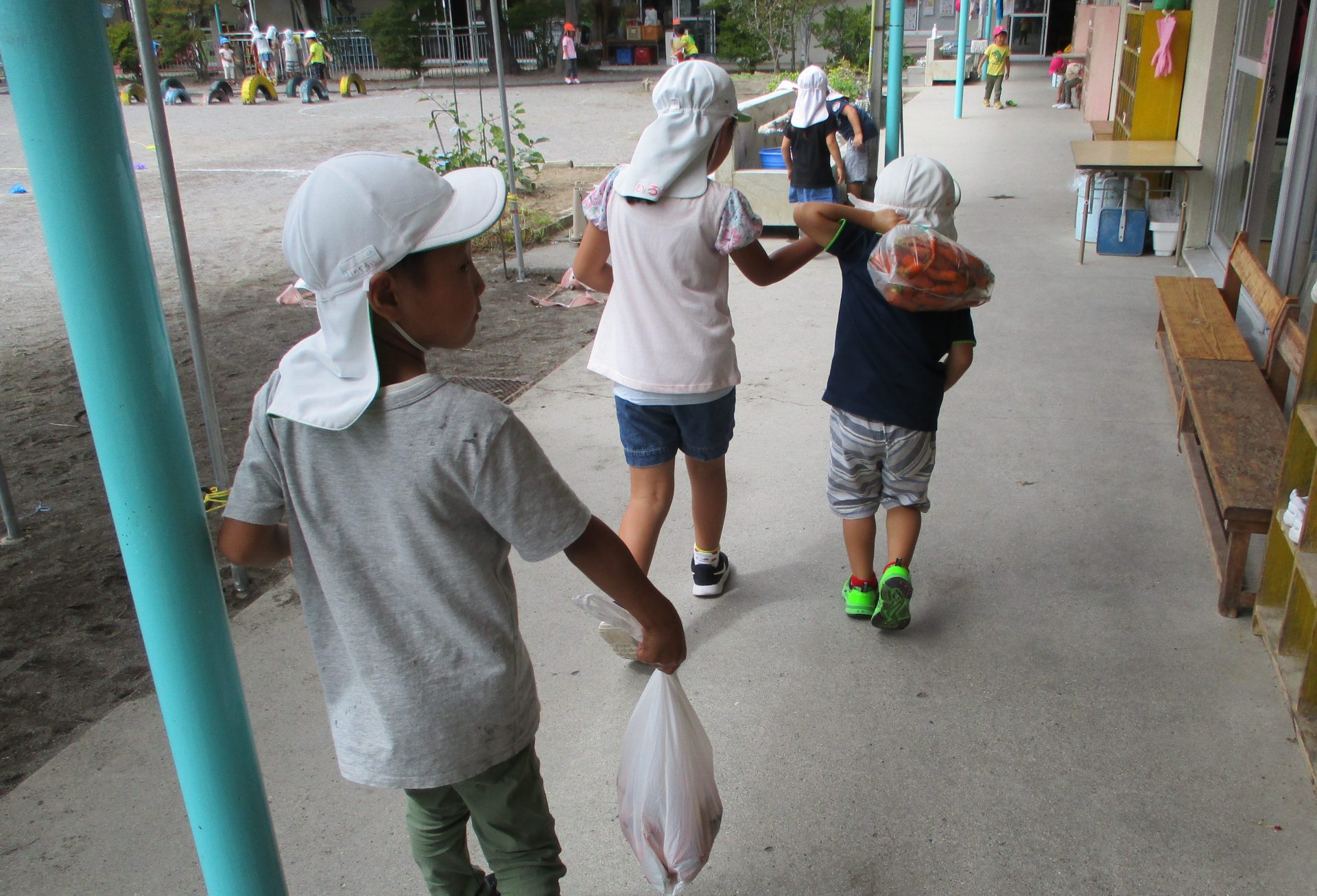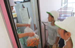 泥だらけの人参をみんなで洗ったら、給食先生に届けます。