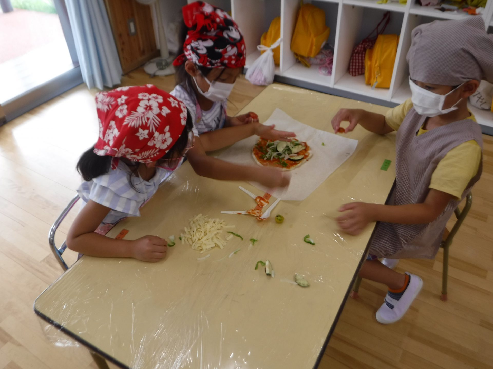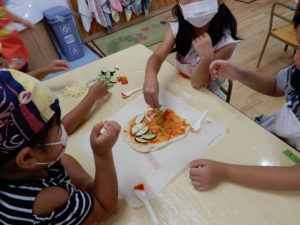 ピーマンに玉ねぎ、畑で育てたトマトとナスも一緒にトッピング♪「トマトおいしそう♪」「ナス焼けるかな~?」ドキドキワクワクのトッピングタイムでした。