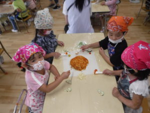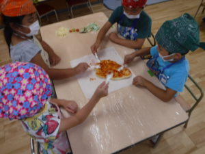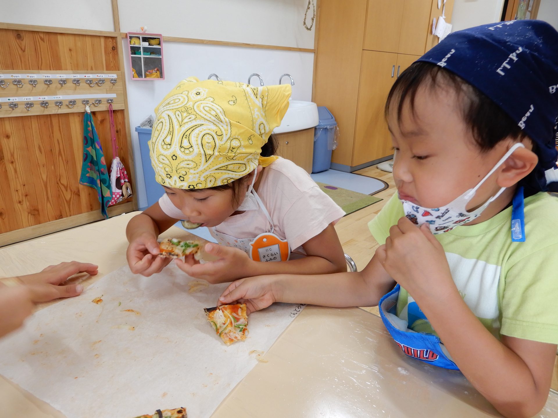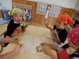「アツアツでおいし~い!」「もっとおかわりしたい!」と、みんなで作ったピザをおいしくいただいた子ども達でした。