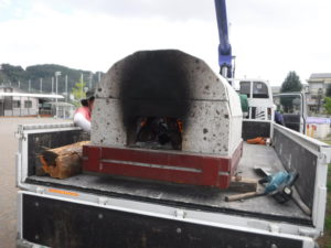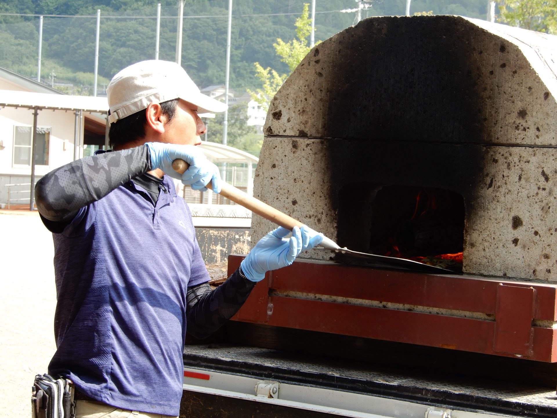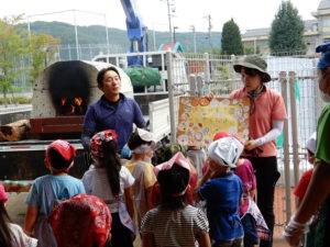 地域の方がピザ窯を保育園に持て来てくださり、ピザを焼いてくださりました。「大きい!」「熱そうだね!」と子ども達も興味津々!