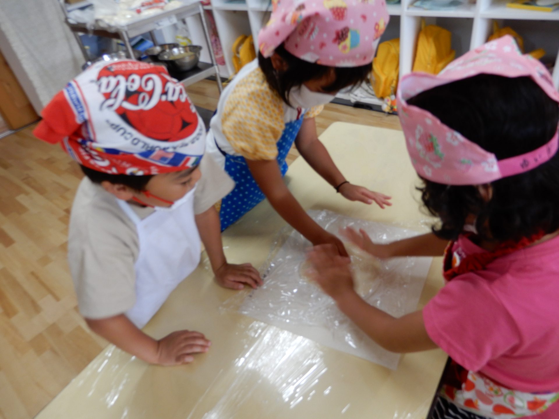 「なんだかふわふわしてる♪」「冷たくって気持ちいい!」と、生地の感触も楽しみながら、サランラップの上から生地を伸ばしていきます。