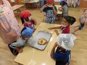 ついにピザが完成!「ピザの焼ける音がする「いいにおいがするね!」「触ると熱いよ!」「ちょっと焦げてるところもある~」と、五感を目一杯使ってピザを観察していました。