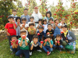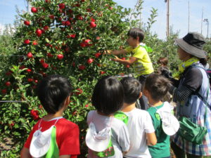 秋の遠足・・・4・5歳児はいつもお世話になっている地域の方の畑で、りんご狩りをしました。