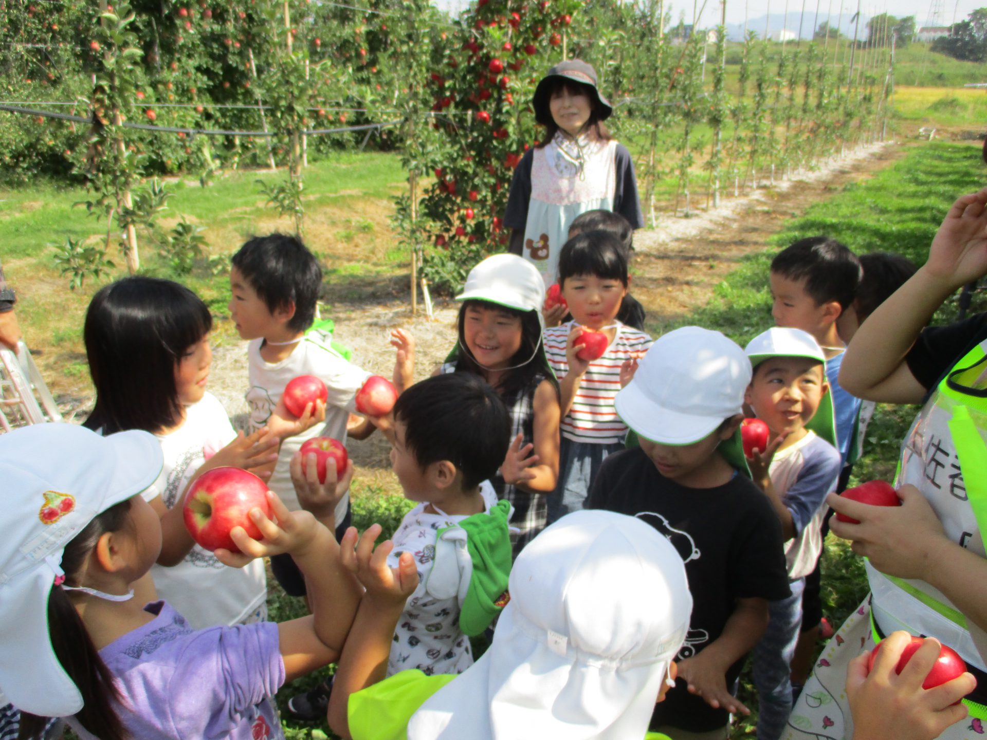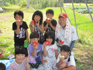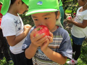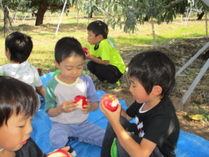 採りたてのりんごを丸かじりして、大満足の子ども達。