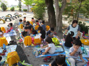 保育園に着くと、一足早く別の場所に遠足に行った3歳児さんが、お弁当を食べていました。