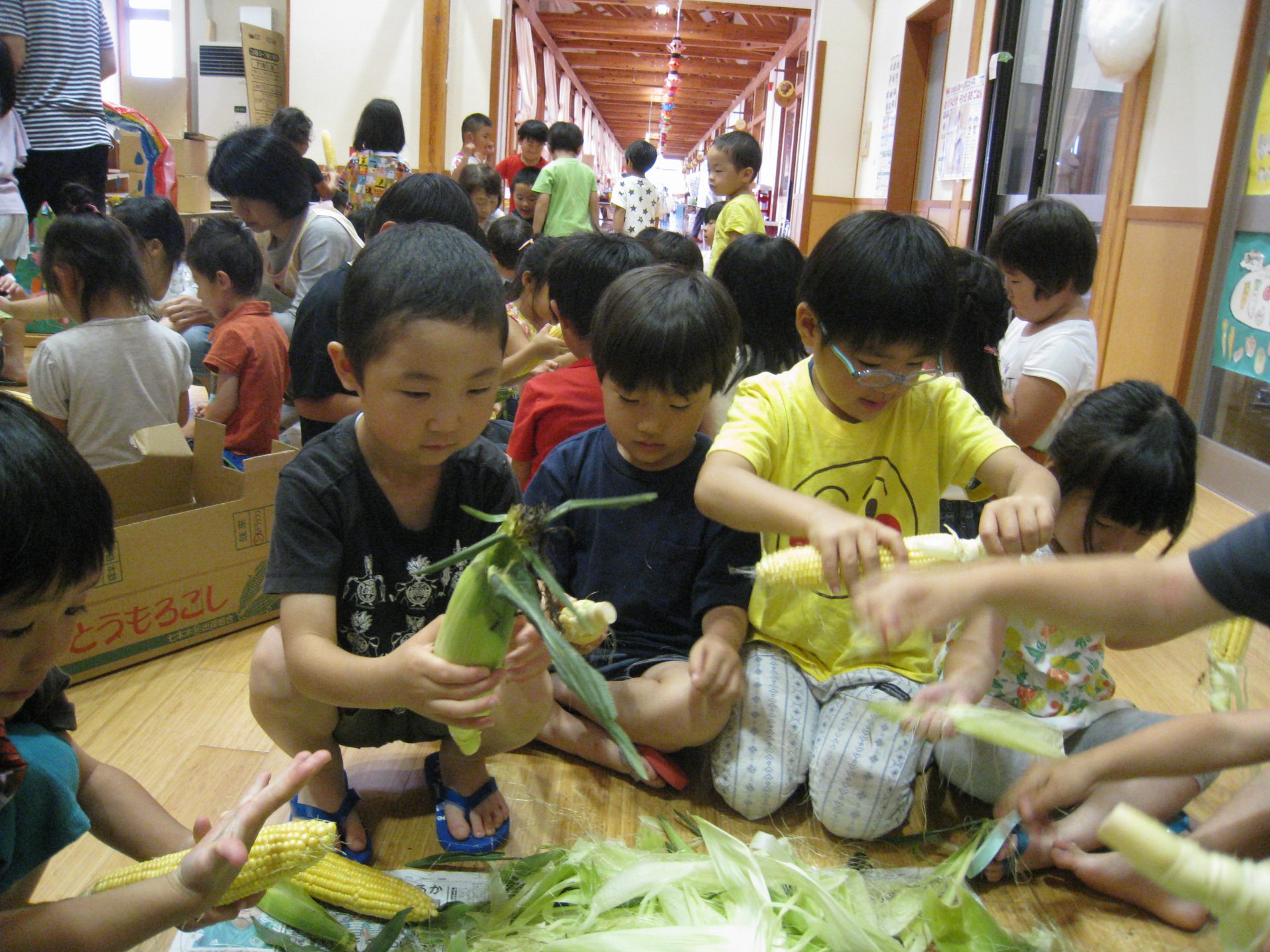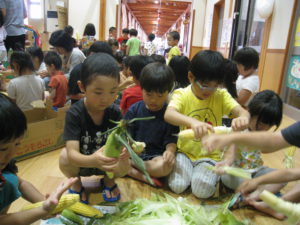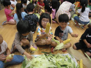 異年齢で力を合わせてトウモロコシむきに挑戦!