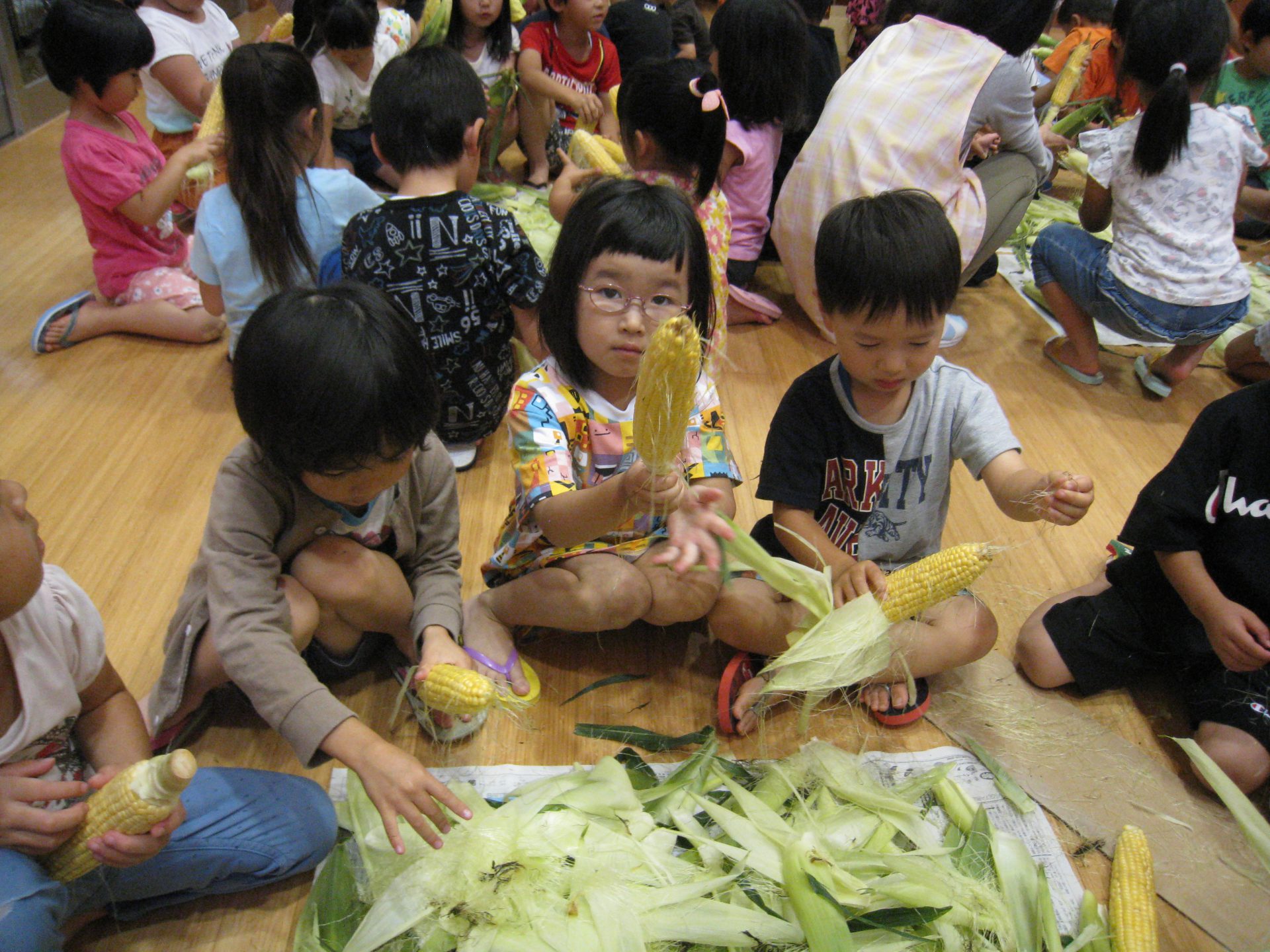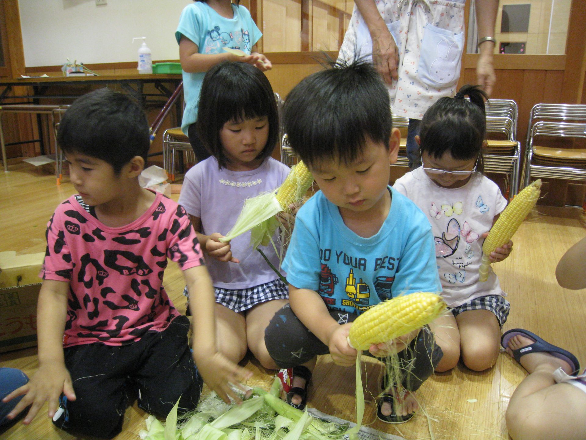 自分たちでむいたトウモロコシをおやつに蒸してもらいます。