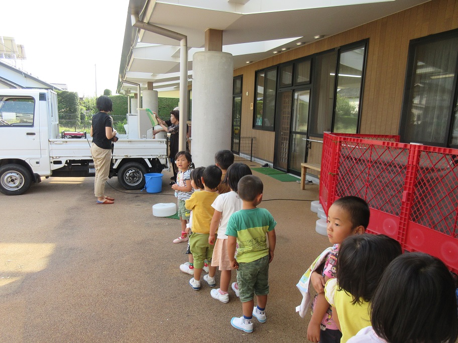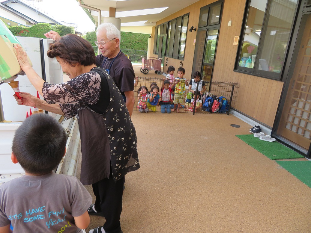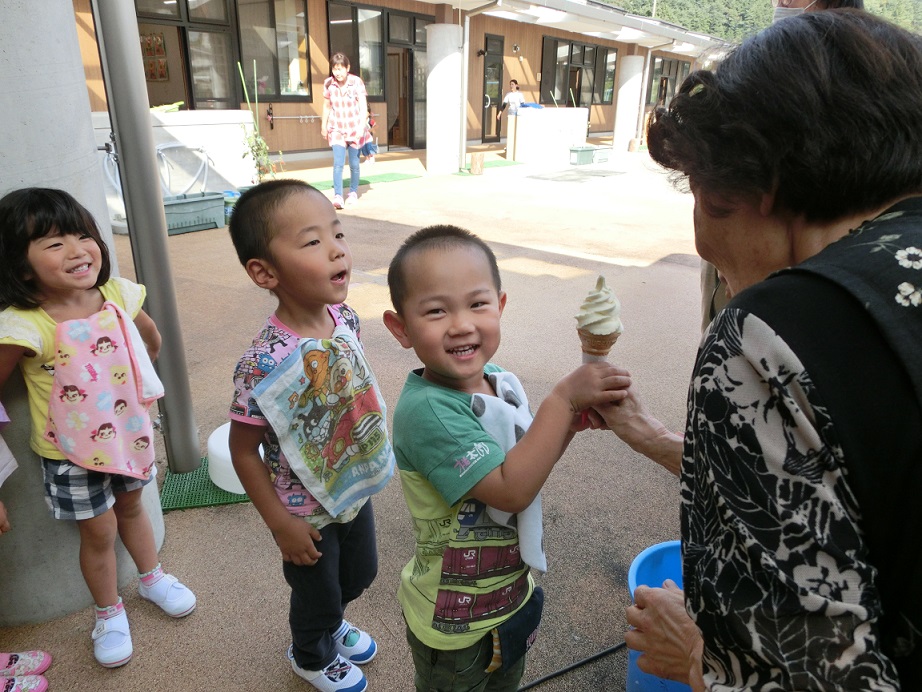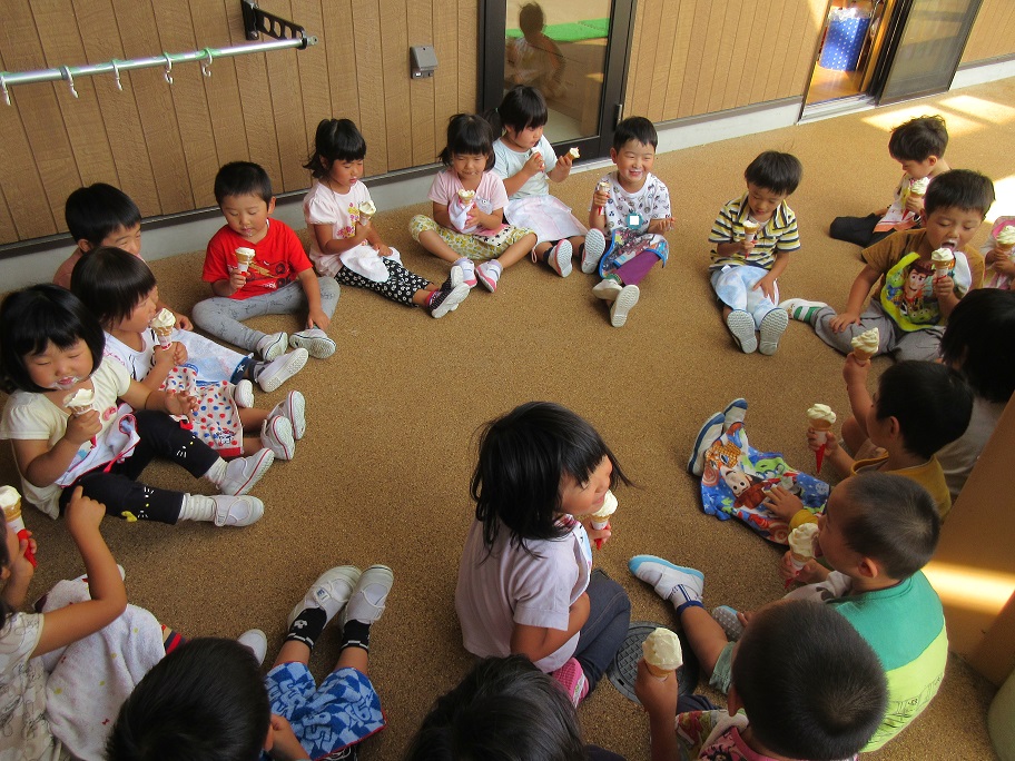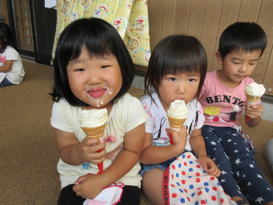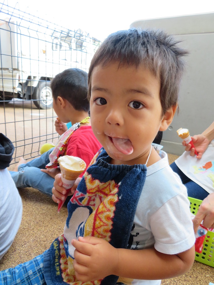 今年も業者さんがご厚意でおやつにソフトクリームを提供してくださいました。今日のおやつはソフトクリーム!年少児は今か今かと待ち、園庭に業者さんの車を見つけると「来た!」