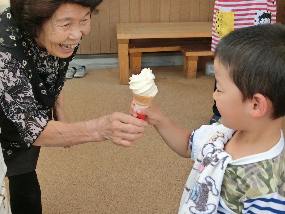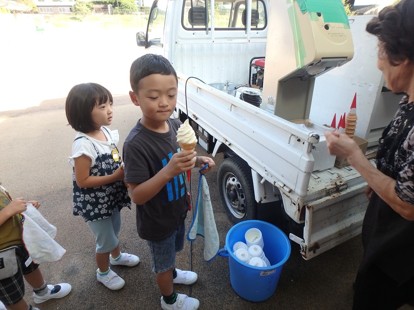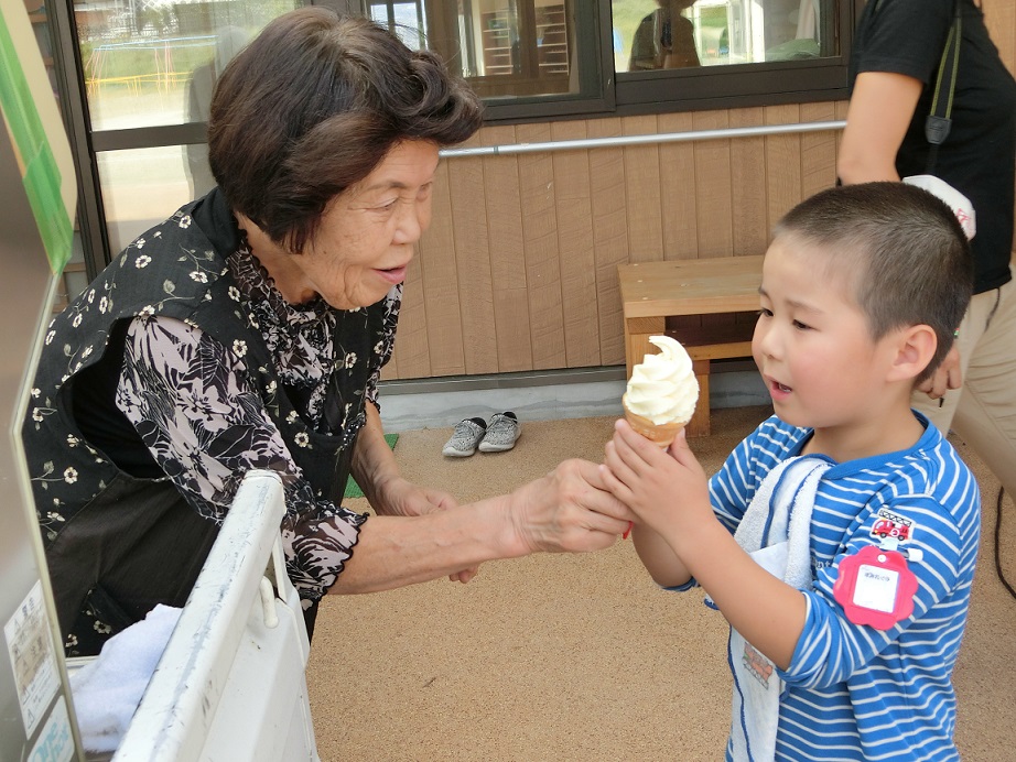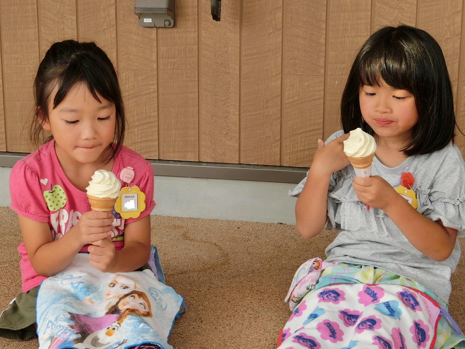 子どもたち全員にソフトクリームを作ってくれて帰るところです。まだ、食べていた2歳児も思わず立ち上がって「ありがとうございました!また来てね!」