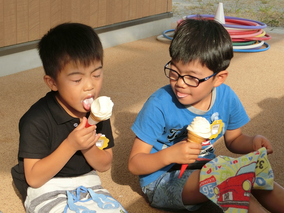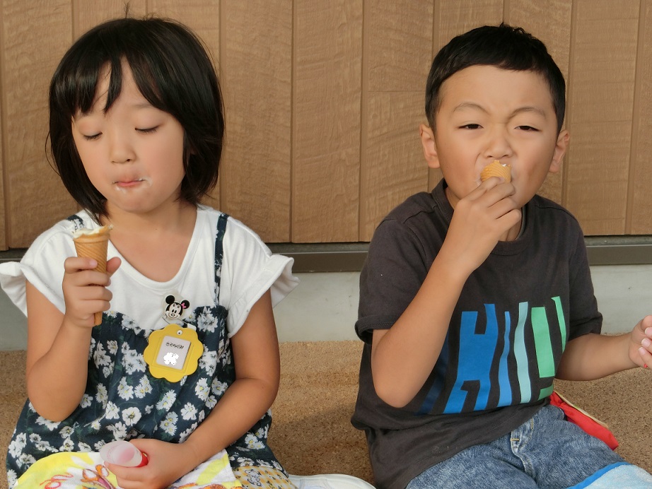 年少児はテラスに丸くなってみんなでソフトクリームを食べました。