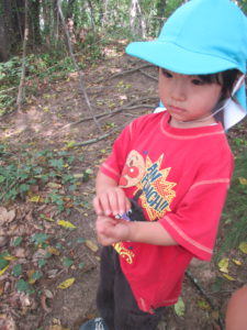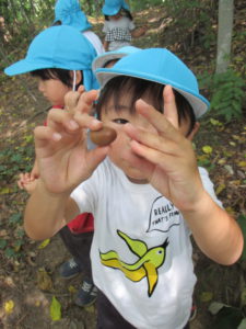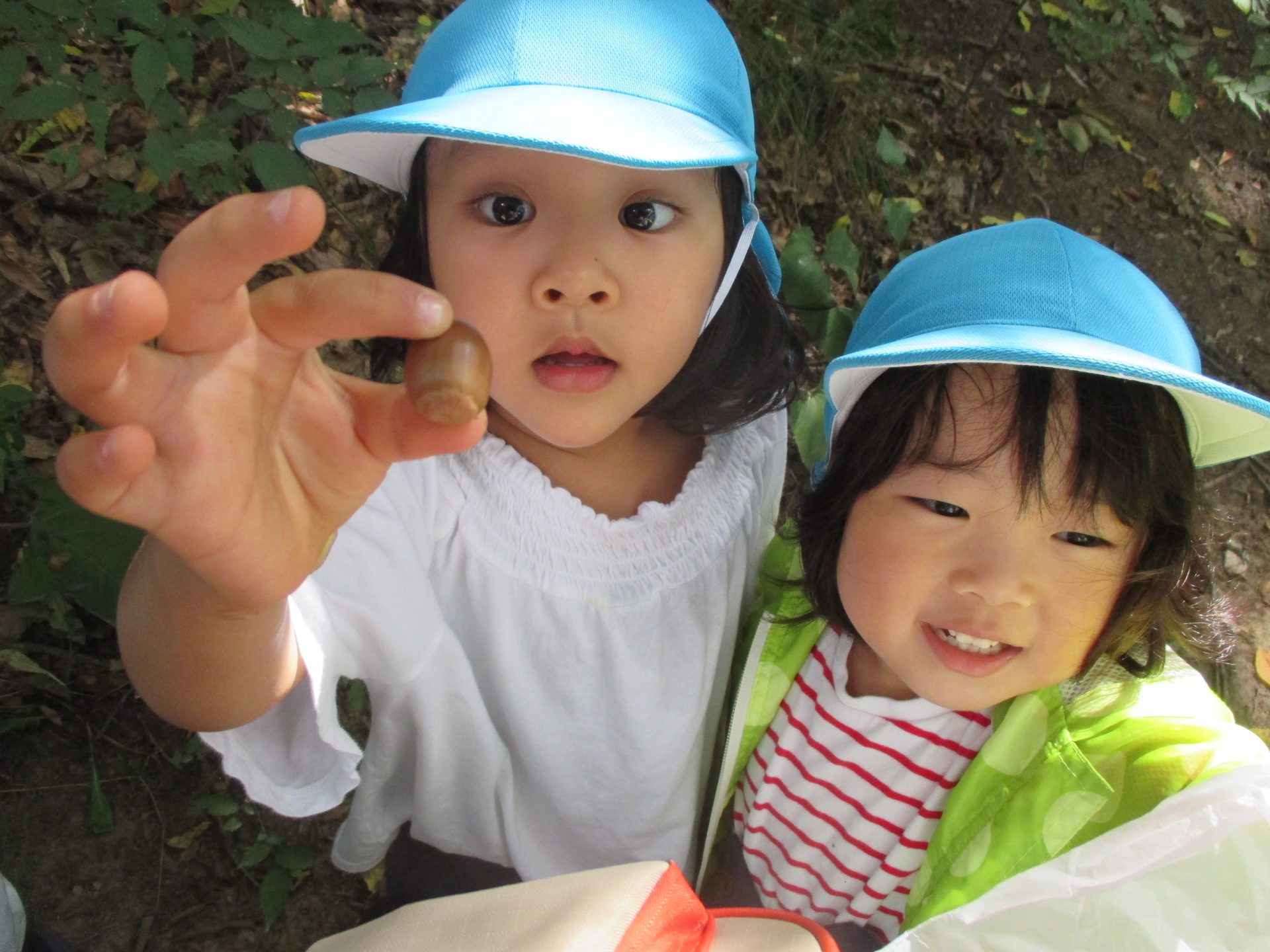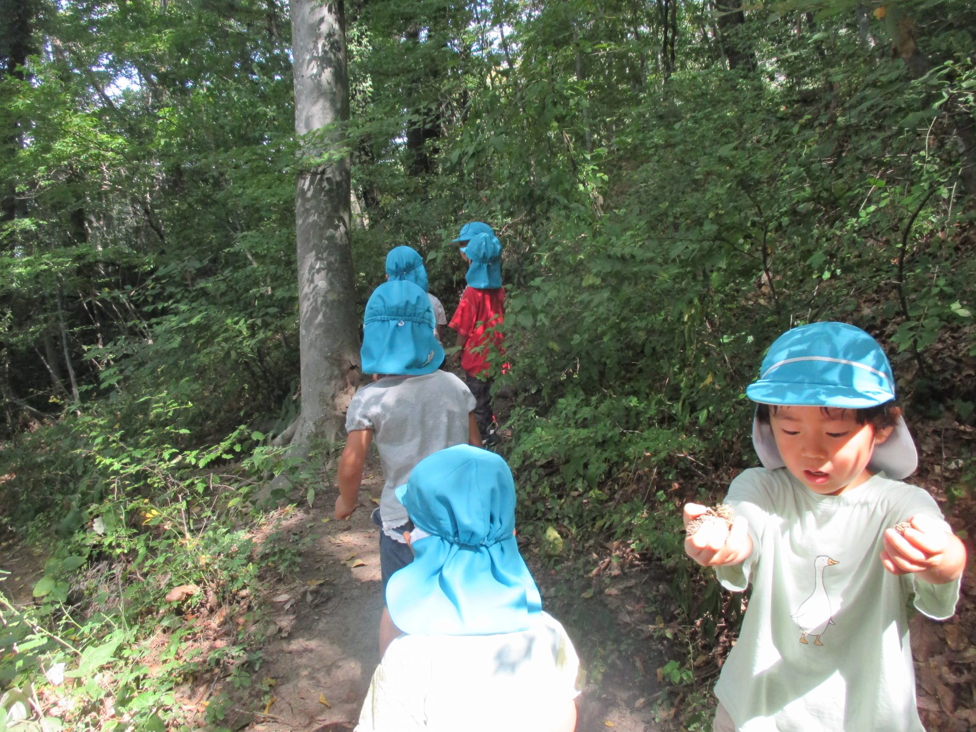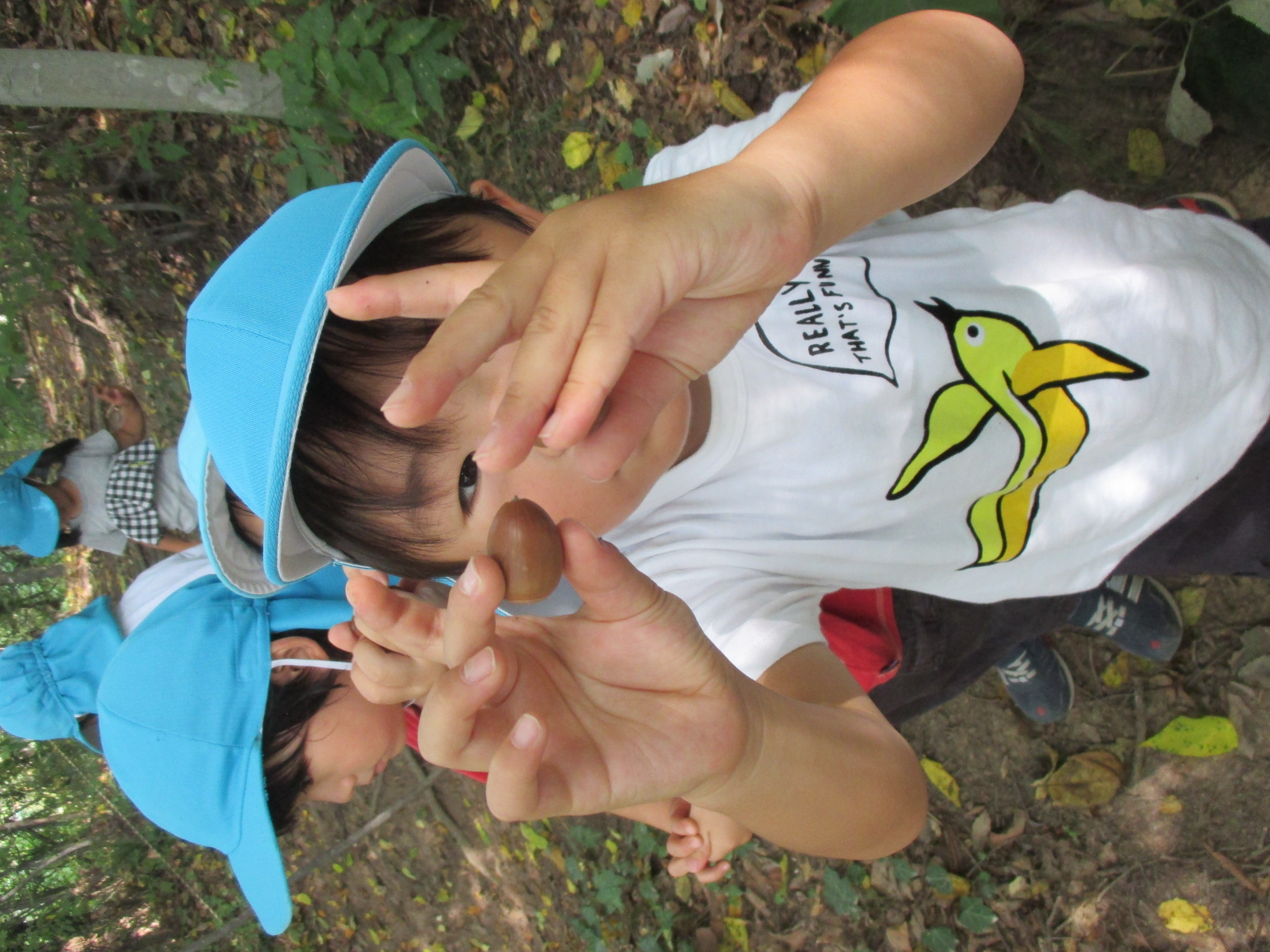 だいぶ涼しくなり、山あそびにはちょうど良い季節となるりました。山にどんぐりが落ち始めたのでみんなでどんぐり拾いに出かけます。久しぶりの山登りです。春の頃と比べると足取りも軽く、坂道も怖がらずに登れる子ども達です。
