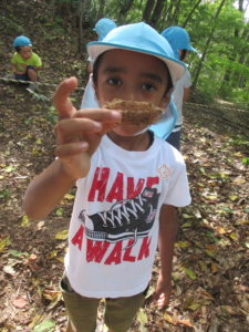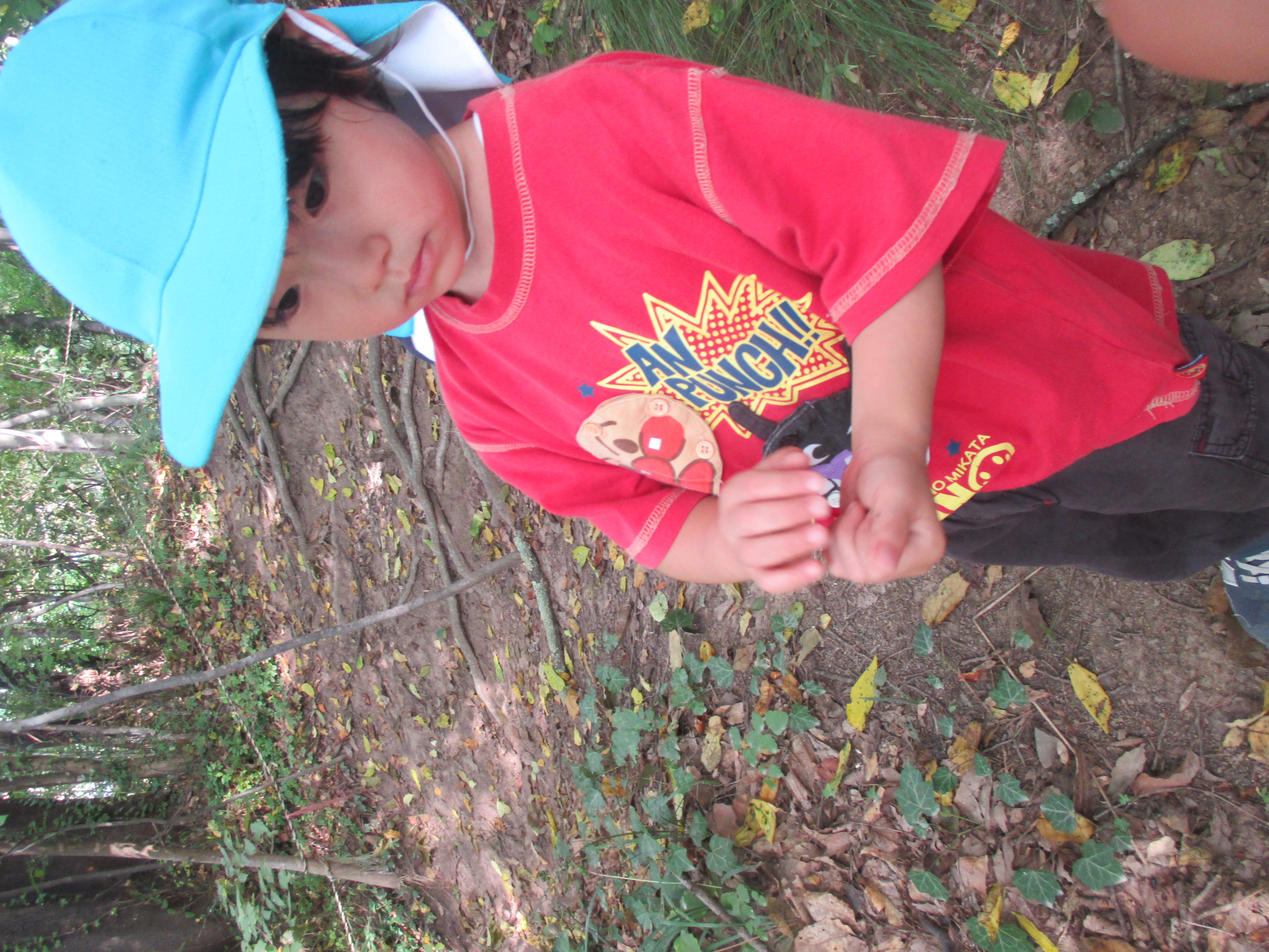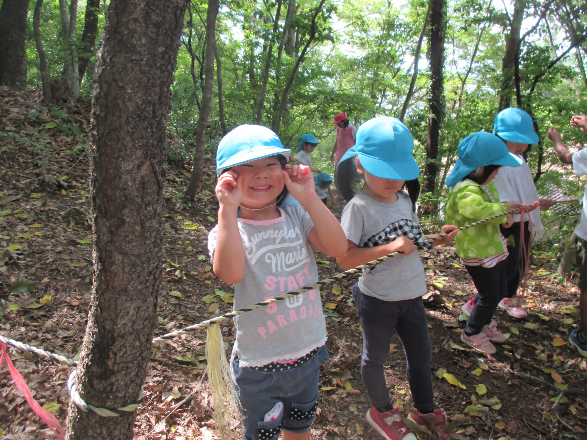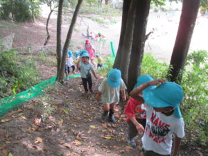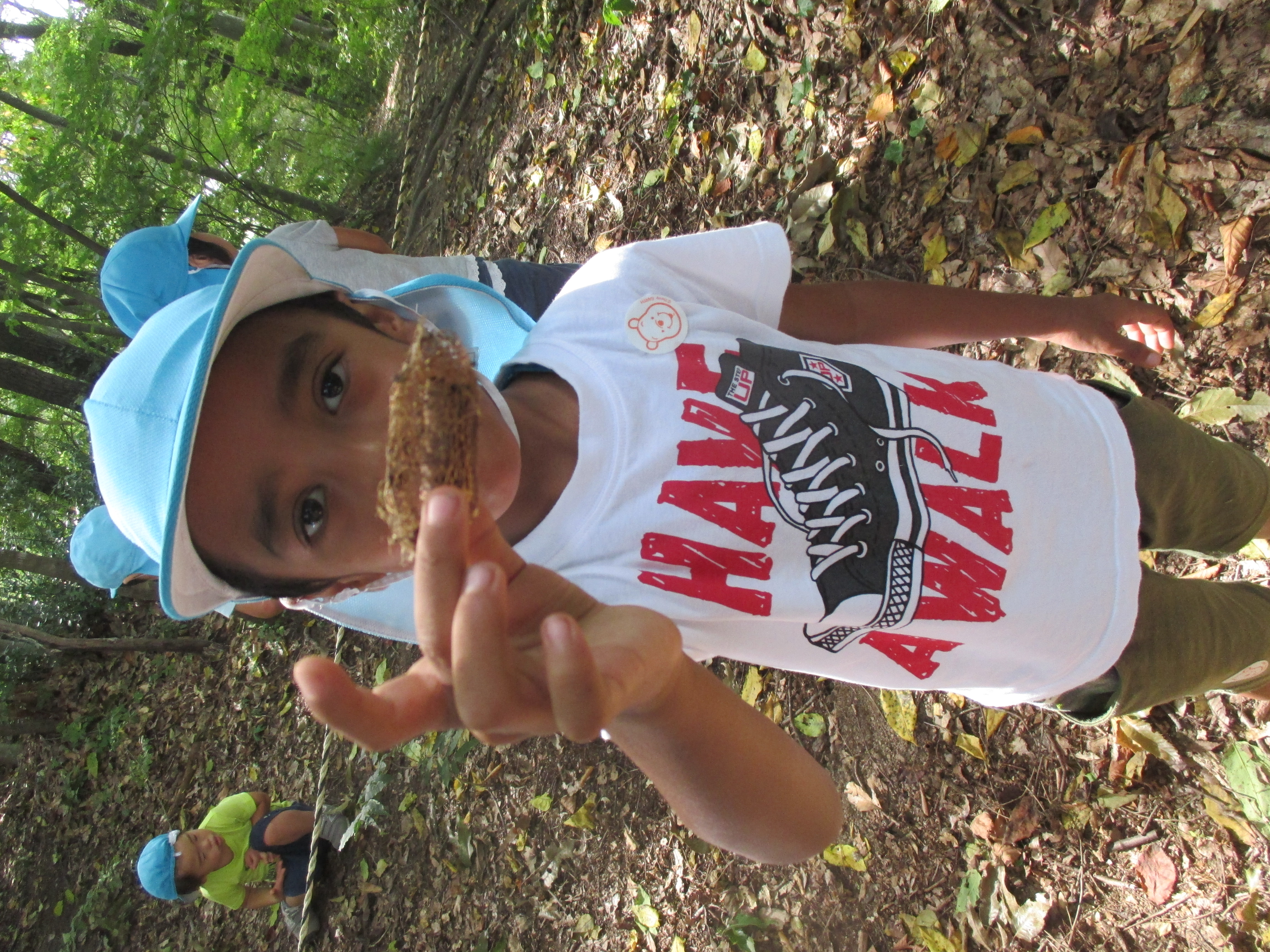 だいぶ涼しくなり、山あそびにはちょうど良い季節となるりました。山にどんぐりが落ち始めたのでみんなでどんぐり拾いに出かけます。久しぶりの山登りです。春の頃と比べると足取りも軽く、坂道も怖がらずに登れる子ども達です。