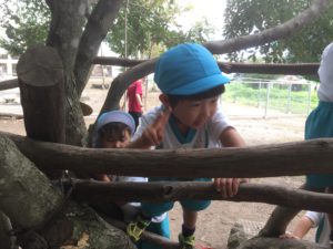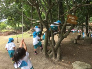 『みのむしブランコ』という遊び場で木登りやターザンロープを楽しんでいます。