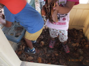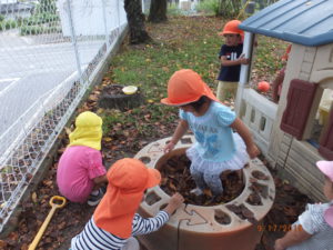 園庭にたくさんあった落ち葉を集めて、遊具の中へ。