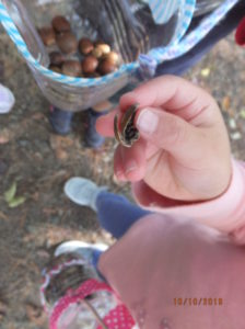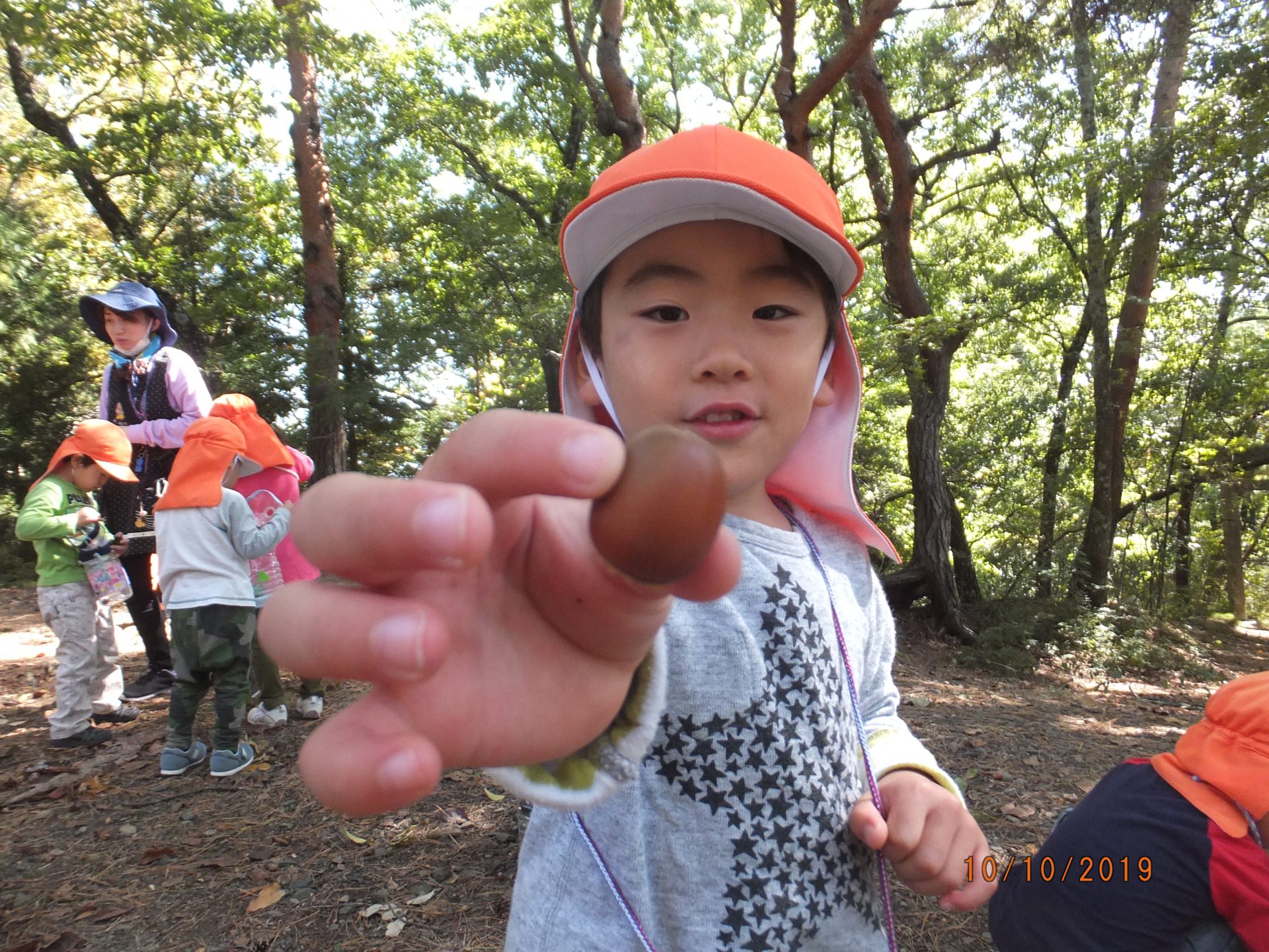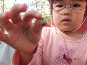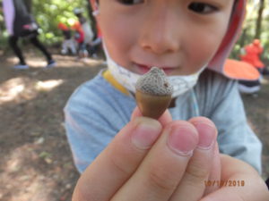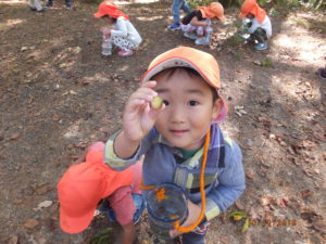 秋ならではの自然との触れ合いと、自分で見つけて集める楽しさ、見つけた喜びを周りの保育士やお友だちと共有する時間にもなりました。どんぐり以外にも、葉っぱや棒、松ぼっくりなど、自然の中にはいろいろなものがあり、それを手にしていろいろと発見や実験をする子どもたちの姿を見ると、自然の中には学びが沢山あるのだなと改めて感じられます。