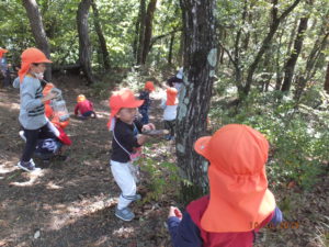 いよいよ湯坂山に到着です。お約束をした後、みんなで一斉にどんぐりを探し始めました。歩くとどんぐりを踏んでしまうくらいたくさん落ちていて、「あったー!」とどんどん見つけてはお散歩バックに入れていく子どもたちです。