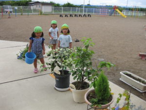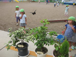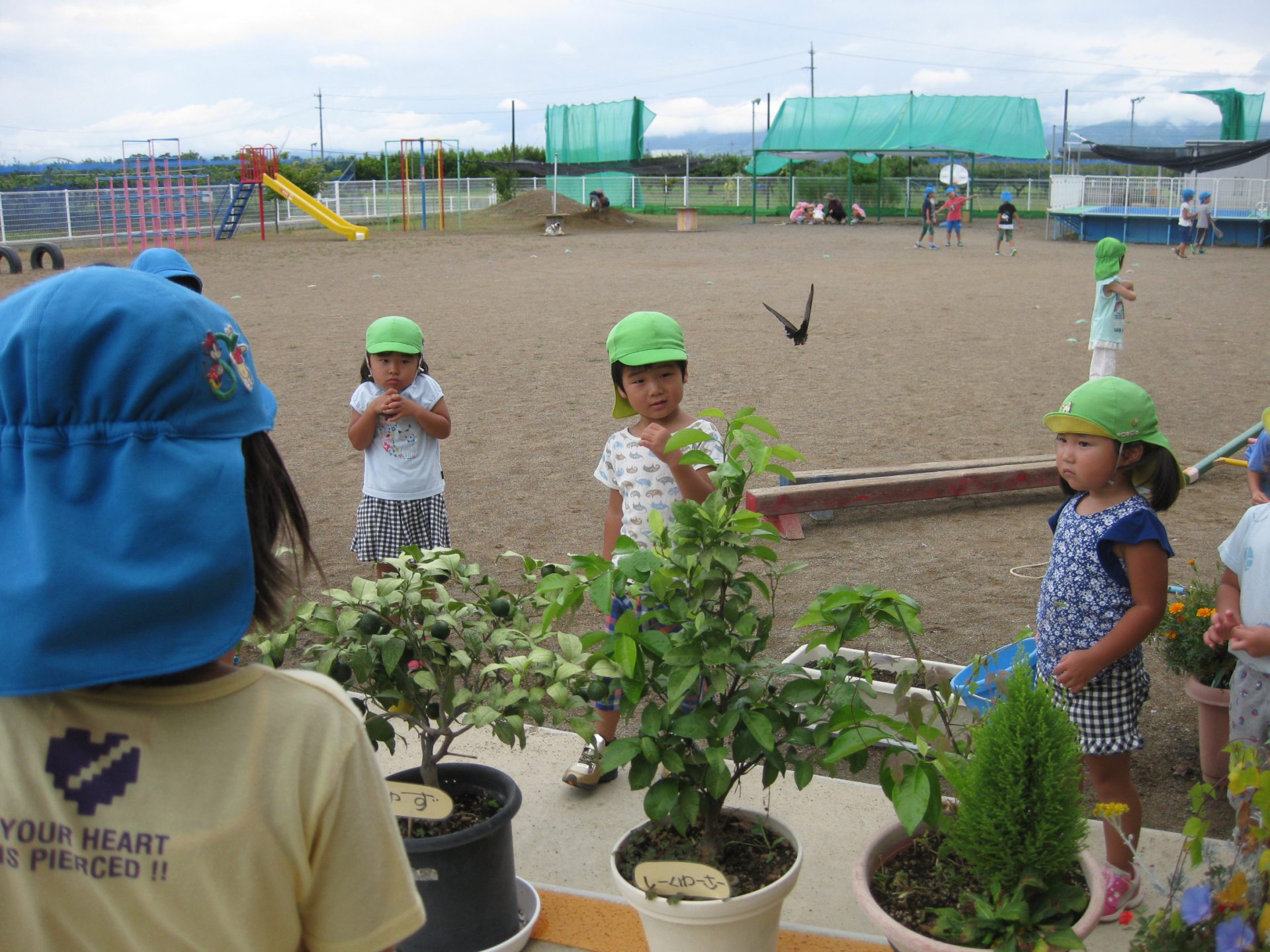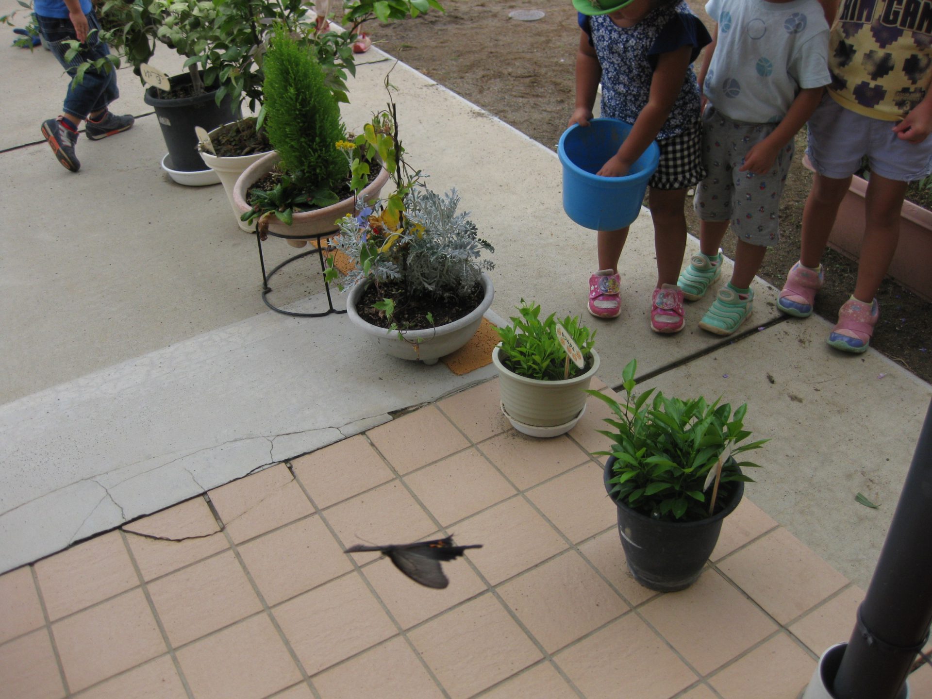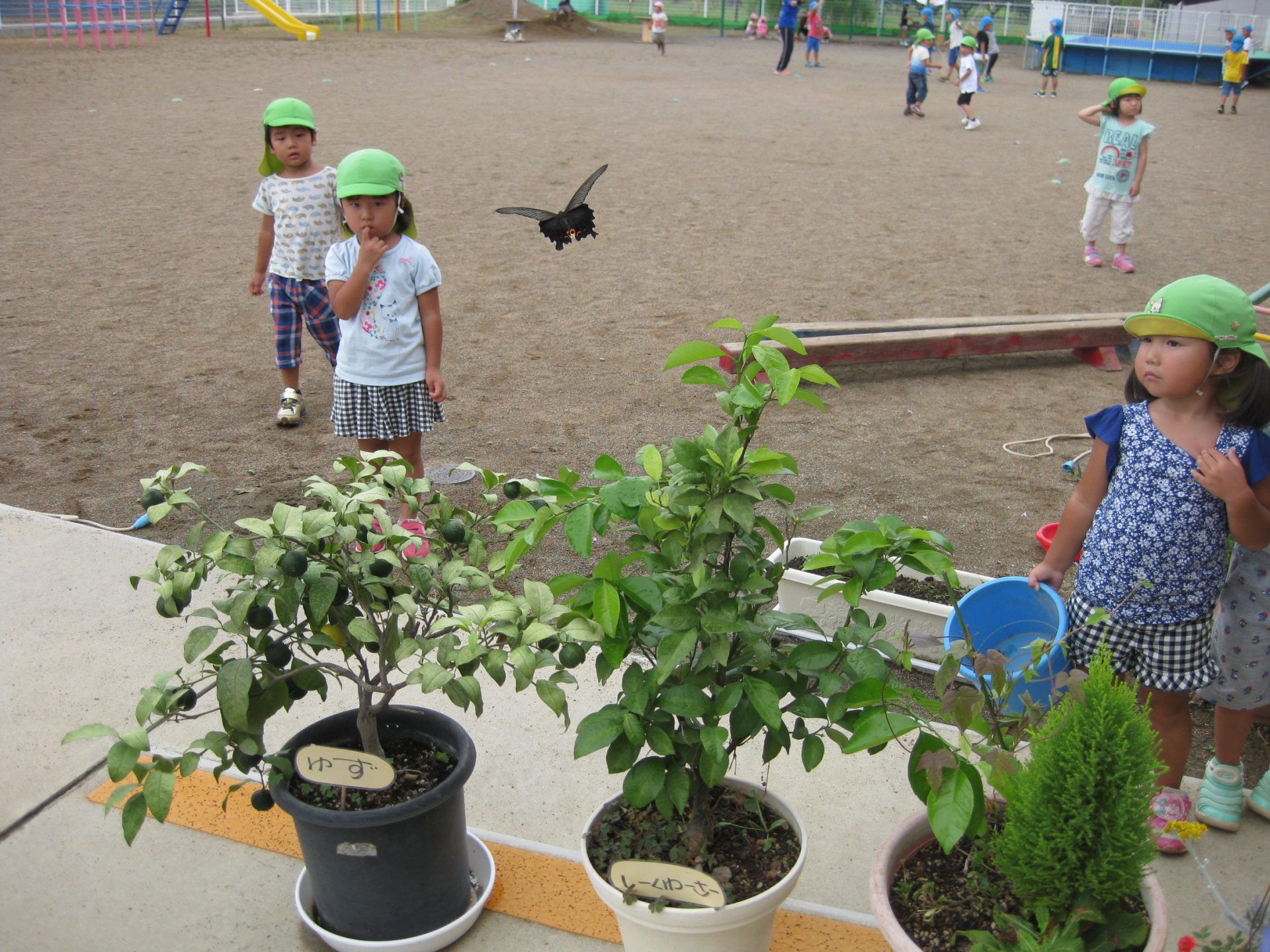 保育園で育てている“ゆず”や“シークワーサー”に大きな黒あげはがやってきました。