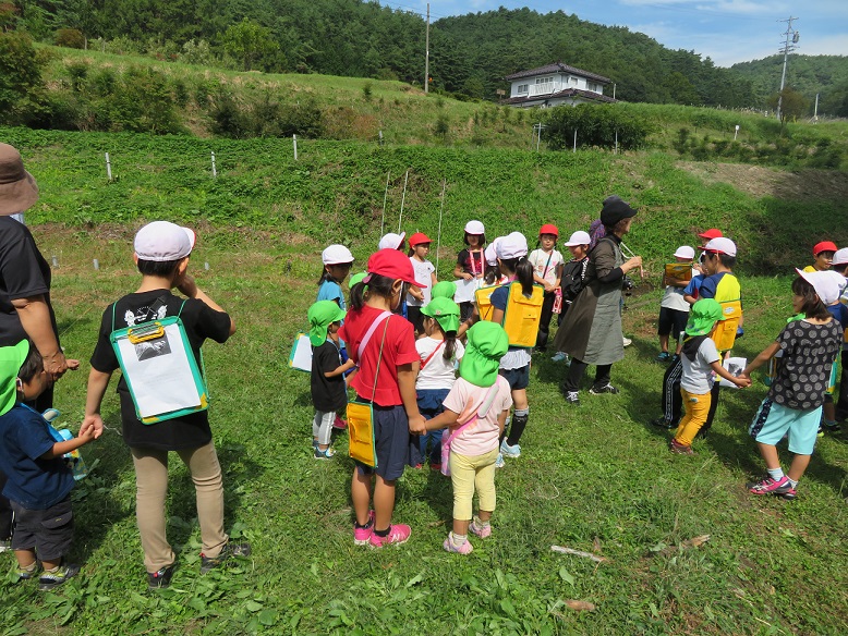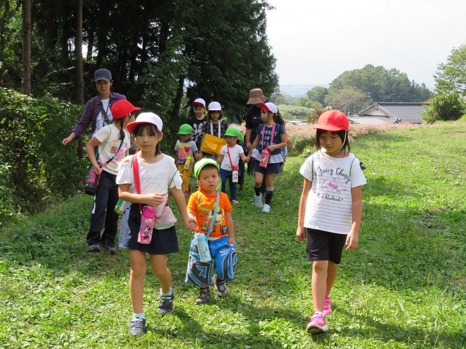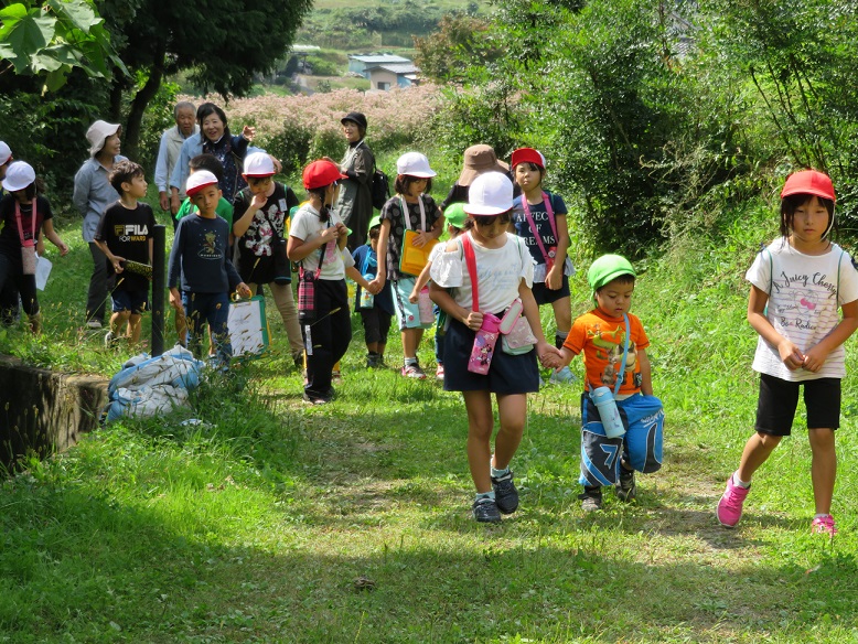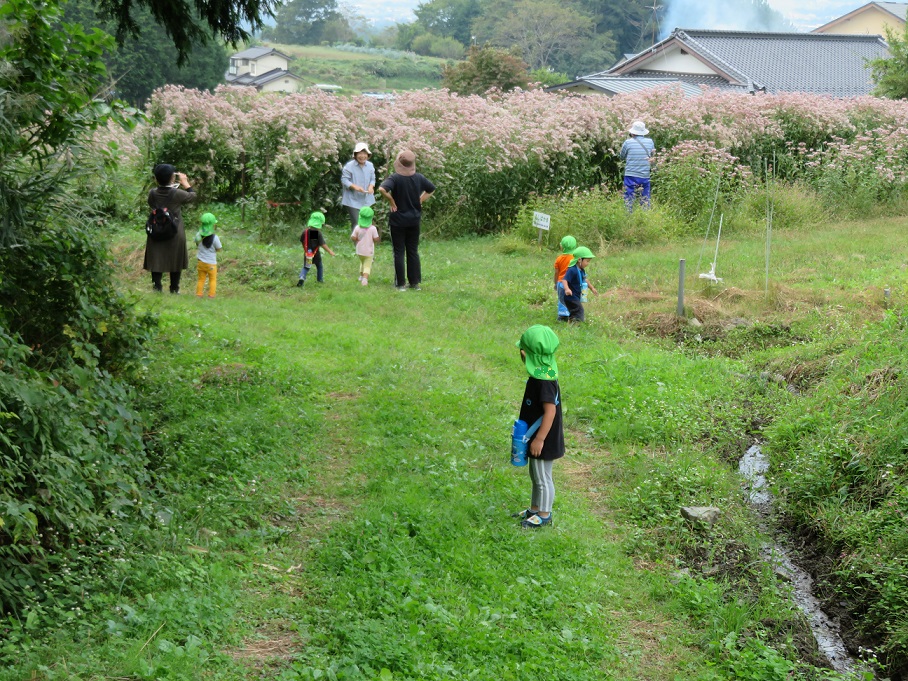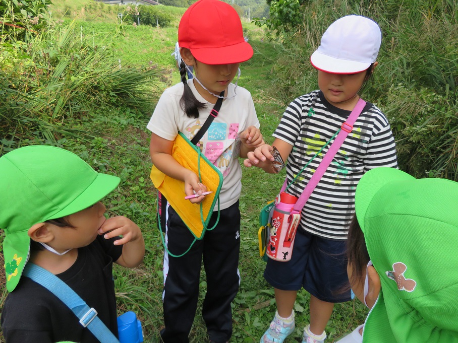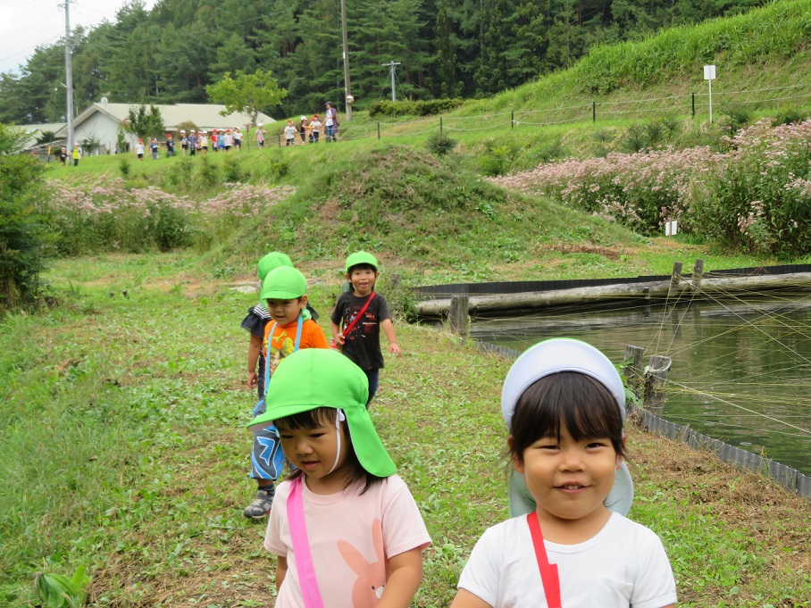 2歳児「こあら組」がこの前見たアサギマダラをまた見ようと知久沢に散歩に来ました。いつもの池の鯉に挨拶をしていると後ろから箕輪東小学校の2年生が・・・