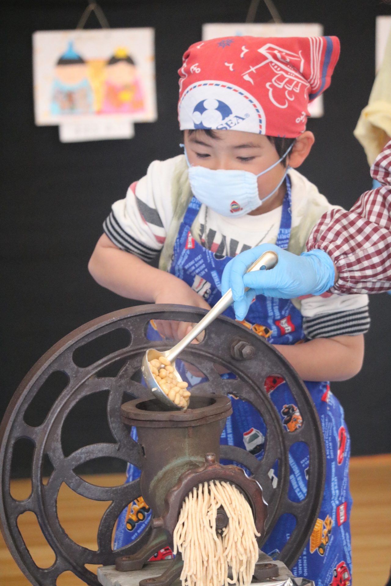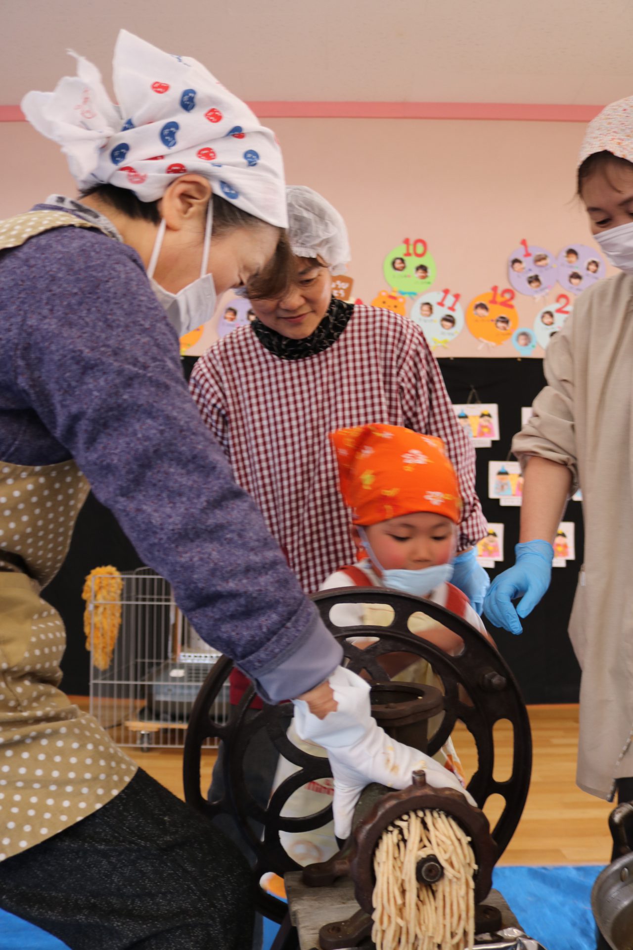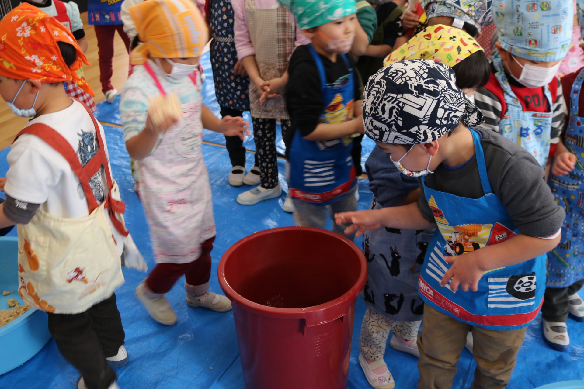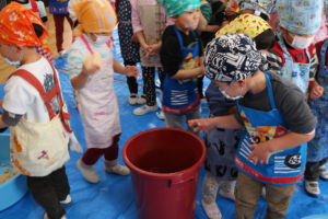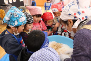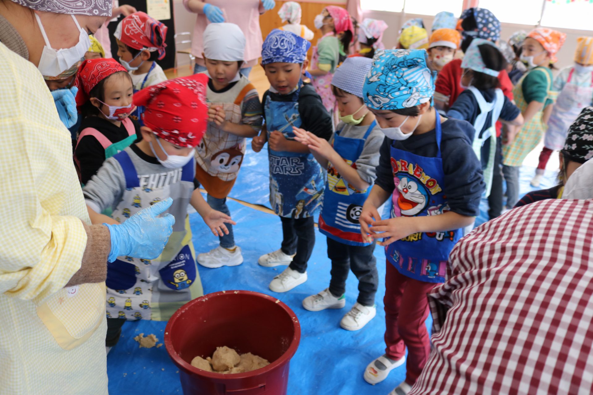 保育園で一年間使う味噌は毎年こうやって地域の方と一緒に作っています。