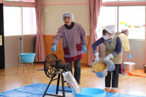 おばあちゃんたちの前にあるのは、地域の方が手作り味噌を作るときに使う機械。