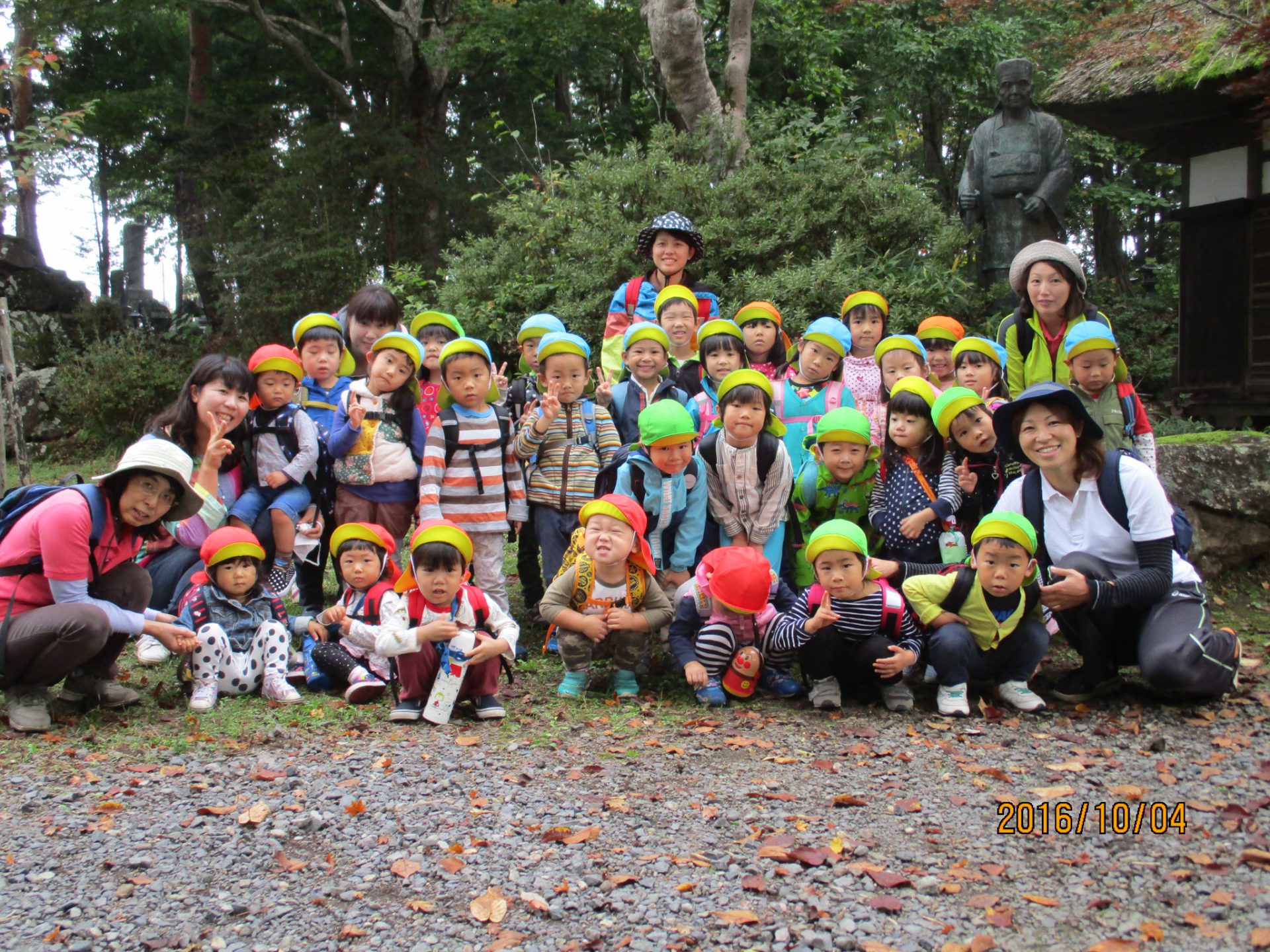 小林一茶さんの像の前で記念写真を撮ってから、いざ探険へレッツゴー!