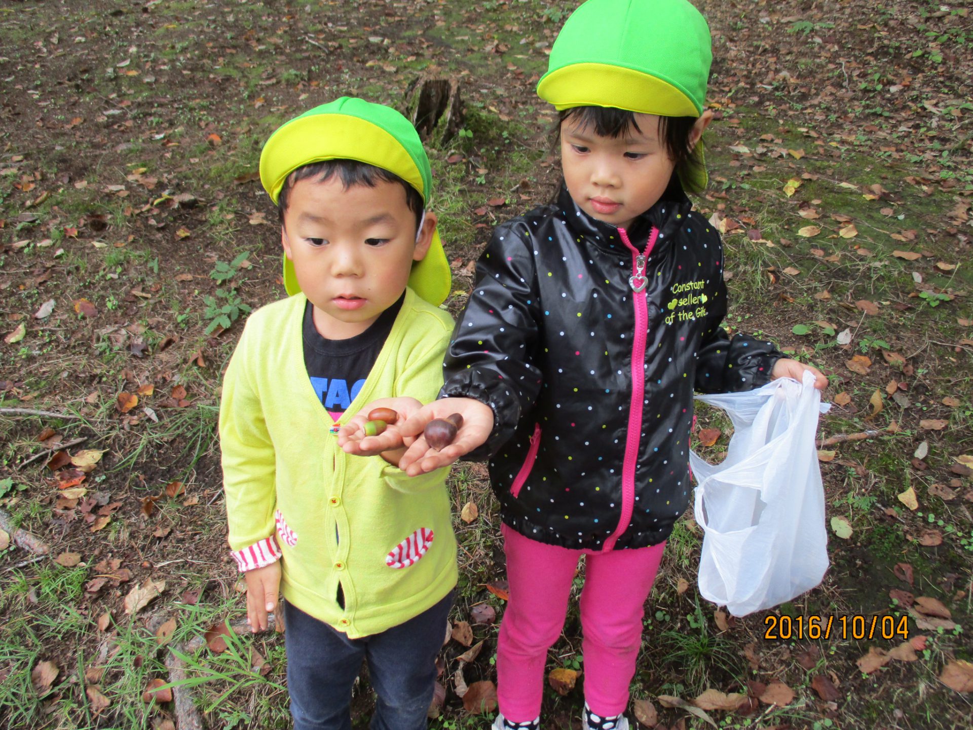 いろんなところにどんぐりがいっぱい!拾い放題だー!ビニール袋がずっしり重くなるまで拾いました。