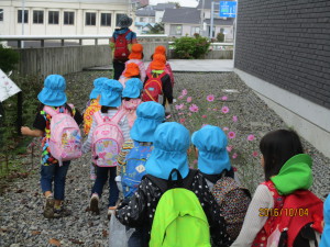 今日は子ども達が楽しみにしていた遠足の日です。ところが朝は小雨が渋々していて心配な天気…。でも柏原は降っていないよ!と情報をもらってバスに乗って出発!「あそこ僕んち!」「あ!私の家の屋根が見える!」と楽しくおしゃべりしていると、あっという間に小丸山公園に到着。