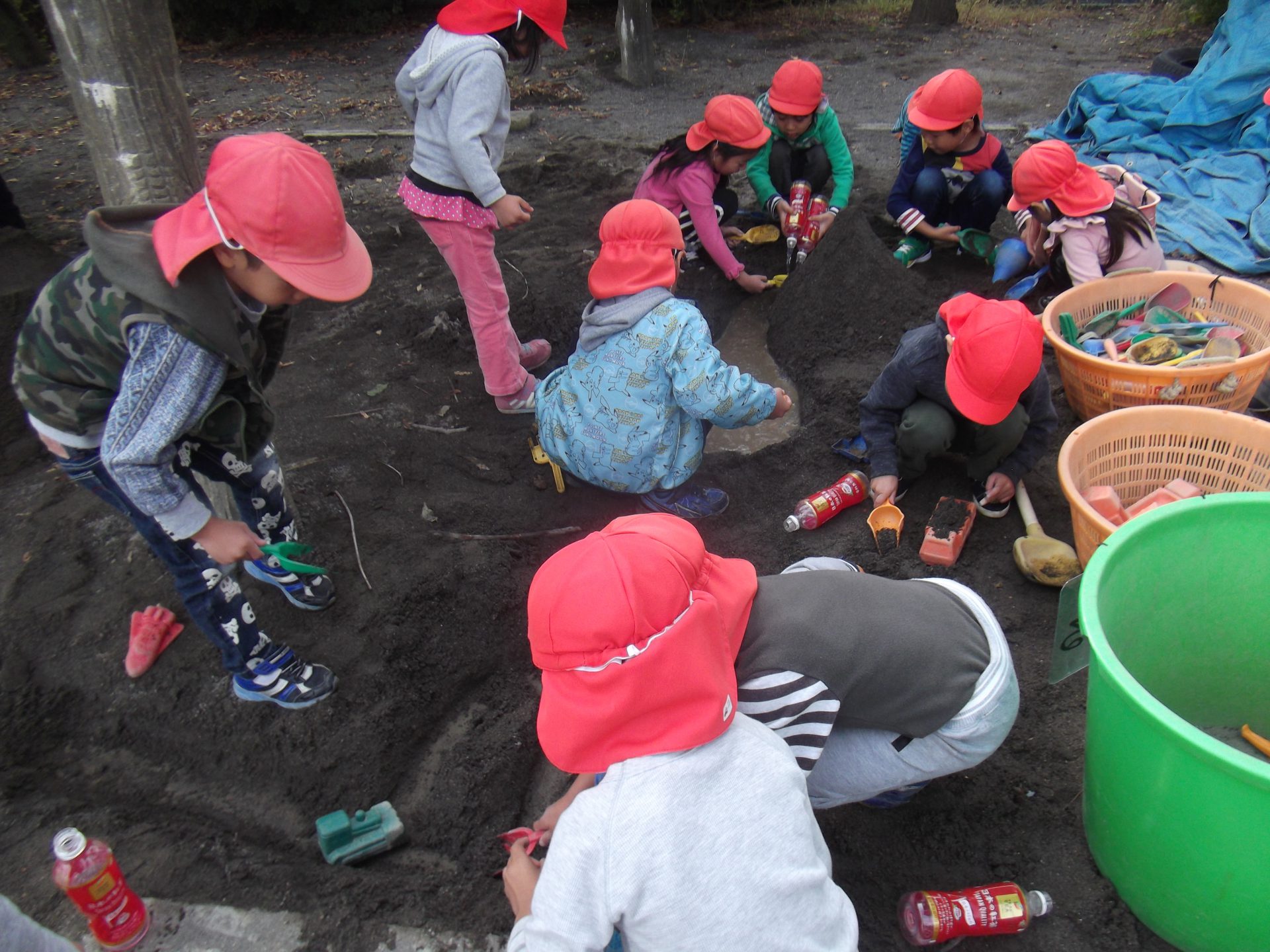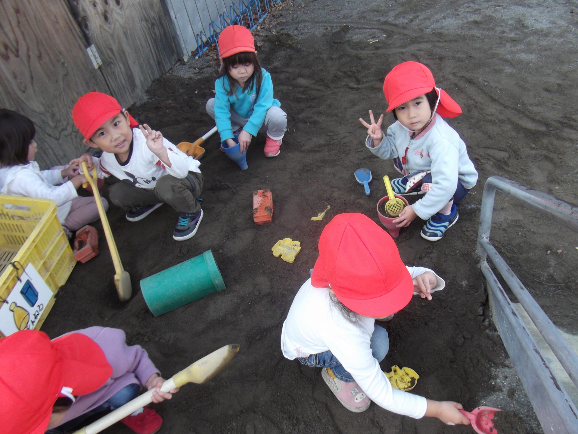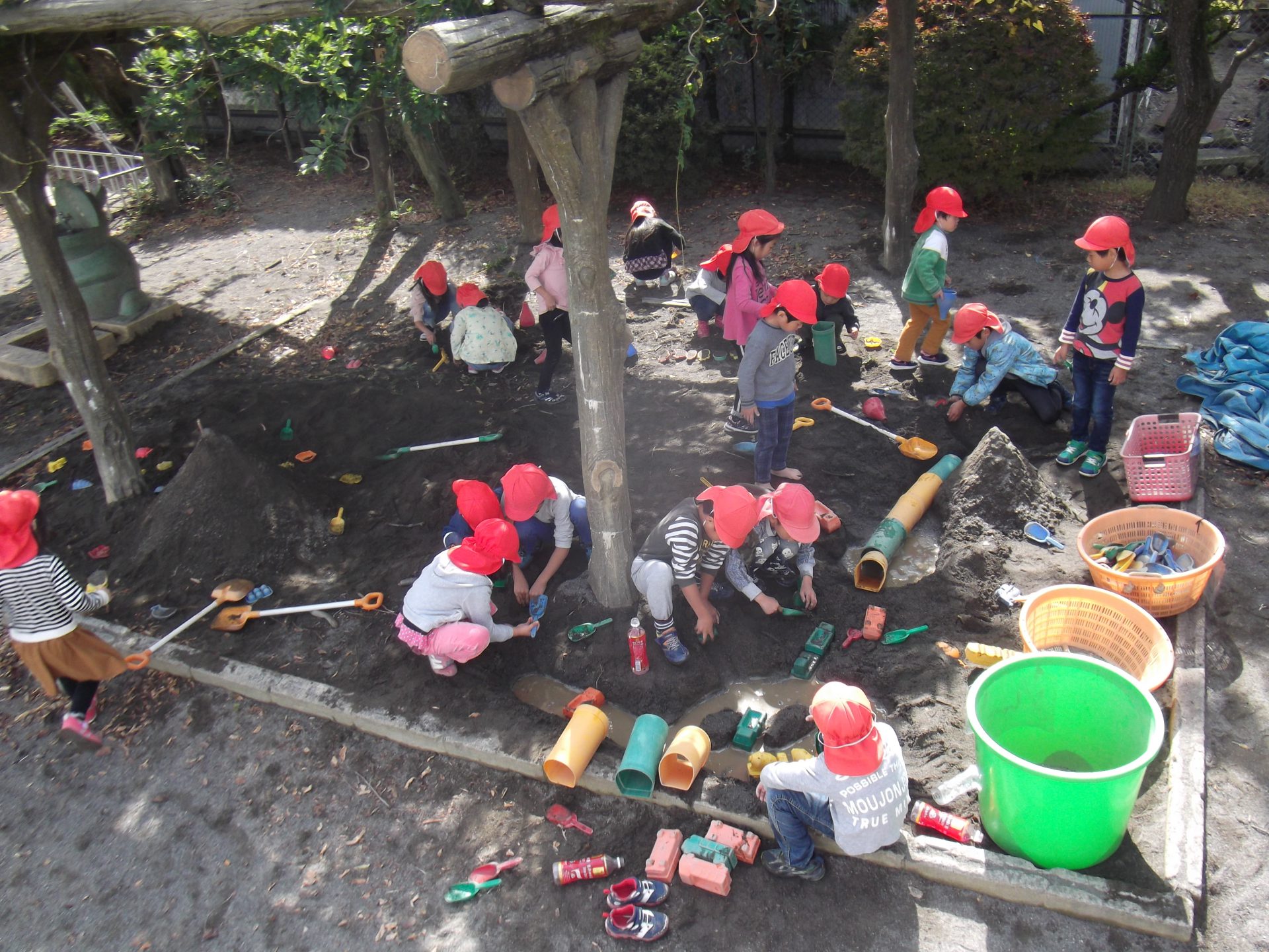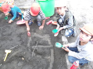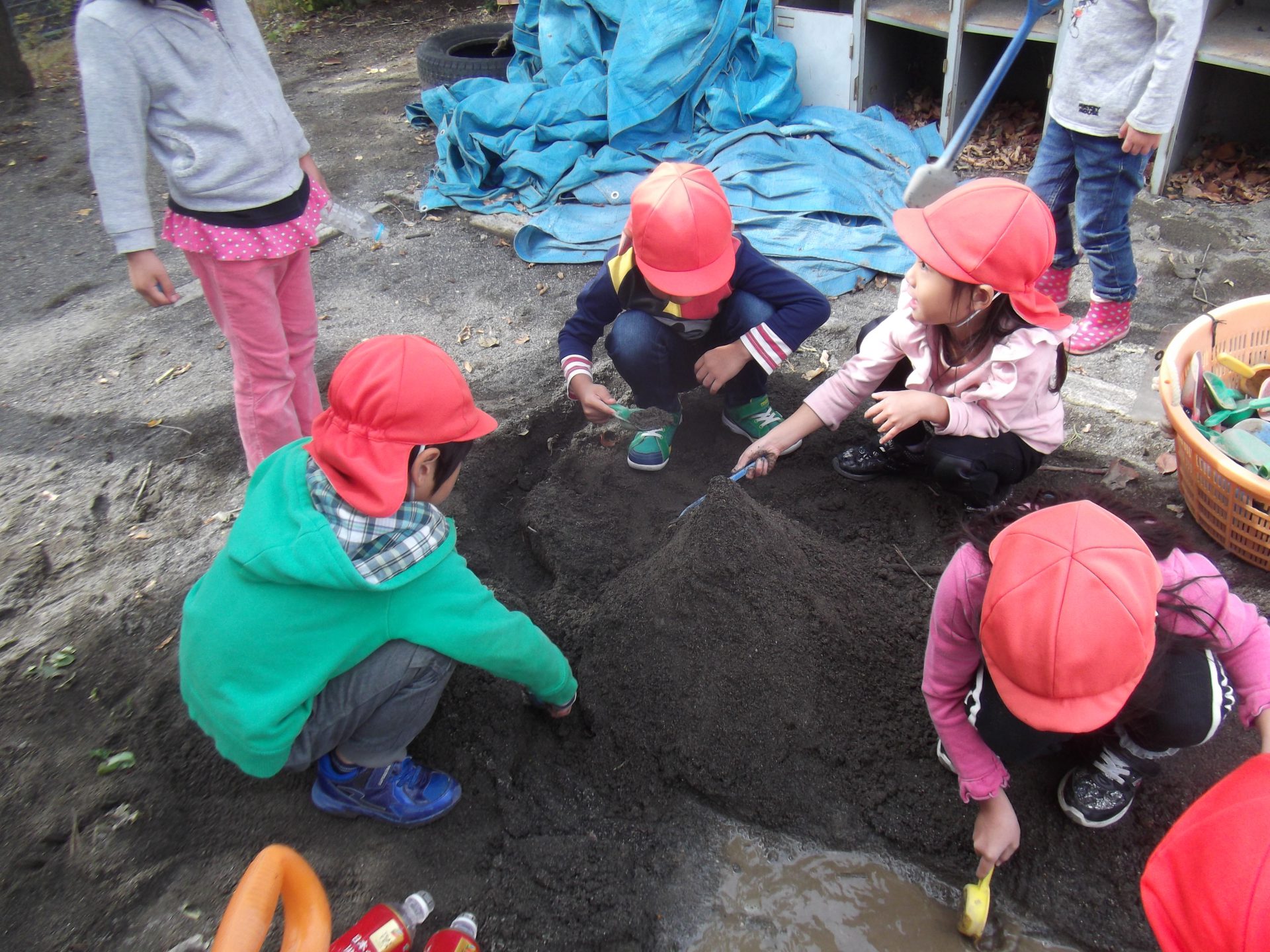 少しずつ涼しくなってきたこの頃ですが、昼間はあたたかく、子どもたちも積極的に戸外遊びを楽しんでいます。最近は、砂場での遊びが人気です!今日は、年長組の子どもたちは、力を合わせて山、川作りをしていました。川を掘り進める子、山を高くしていく子、水汲みに行く子…しっかり役割分担があり、みんなで力を合わせて遊びを進めていました。年少組の子どもたちは、年長さんの楽しそうな遊びに入れてもらったり、真似をして遊んでいました。