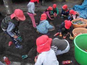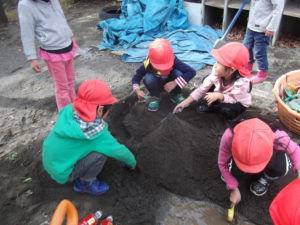 ちょうど、自由遊びの時間に同じ場所で遊び始めた年長組と年少組の子どもたち。どんなかかわりが見られるかな?と、様子を見ていました。年長さんのしている遊びはとても楽しそうで、年少組の子どもたちは興味津々です。中には仲間に入れてもらって、一緒に穴を掘ったり水を入れて遊ぶ子どもの姿もありました。また、自分たちでも穴を掘ってみたりと真似をする姿があったので、年長さんの姿に沢山の刺激を受けていた年少組の子どもたちでした。年長さんは、友達と意見を出し合いながら、また、友達のいい所をほめながら遊びを進める姿が見られ、園でみんなを引っ張る立場としてのしっかりした一面を見せてくれました。こういった普段の遊びも、大切にしていきたいと思っています。