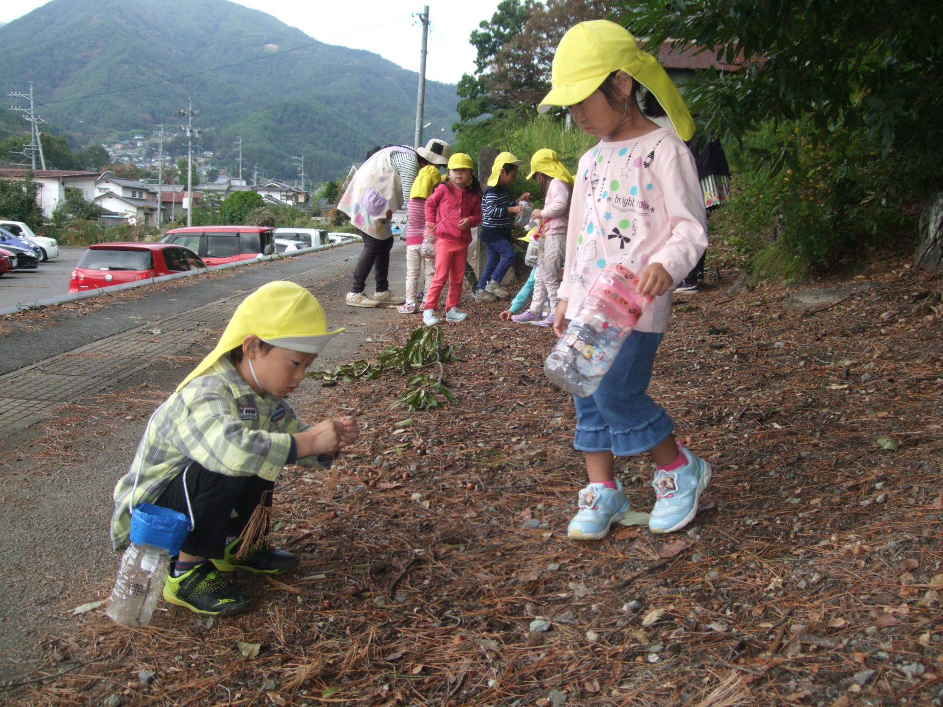 「たくさんのあめとかぜで、きっとたくさん落ちてるよ!」と期待いっぱいの子どもたち。