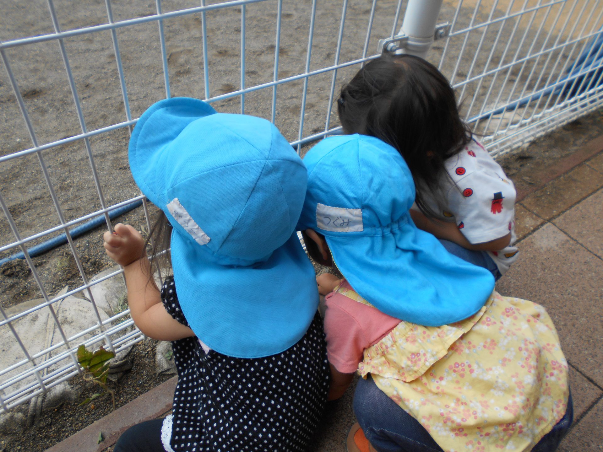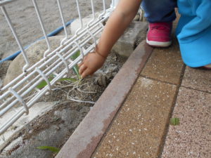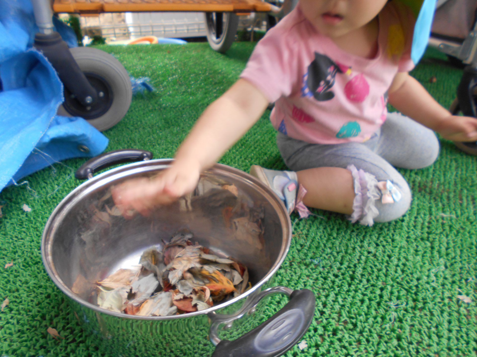 葉っぱは庭の隅の方に沢山集まっていることに気づき「こっちにいっぱいあるよー」と保育士に教えてくれる姿がありました。