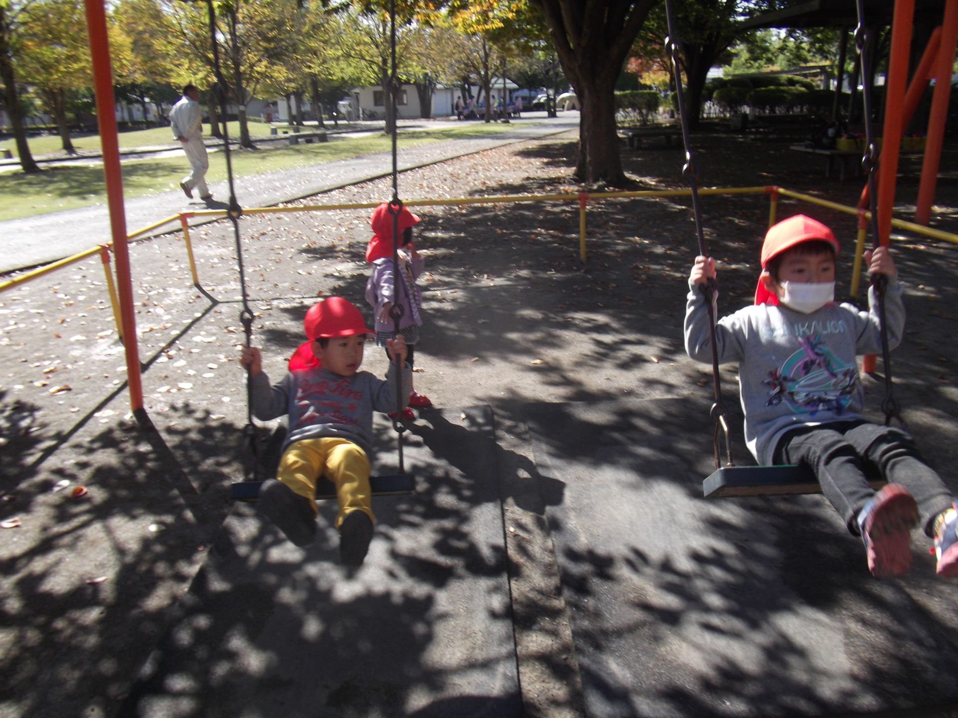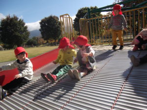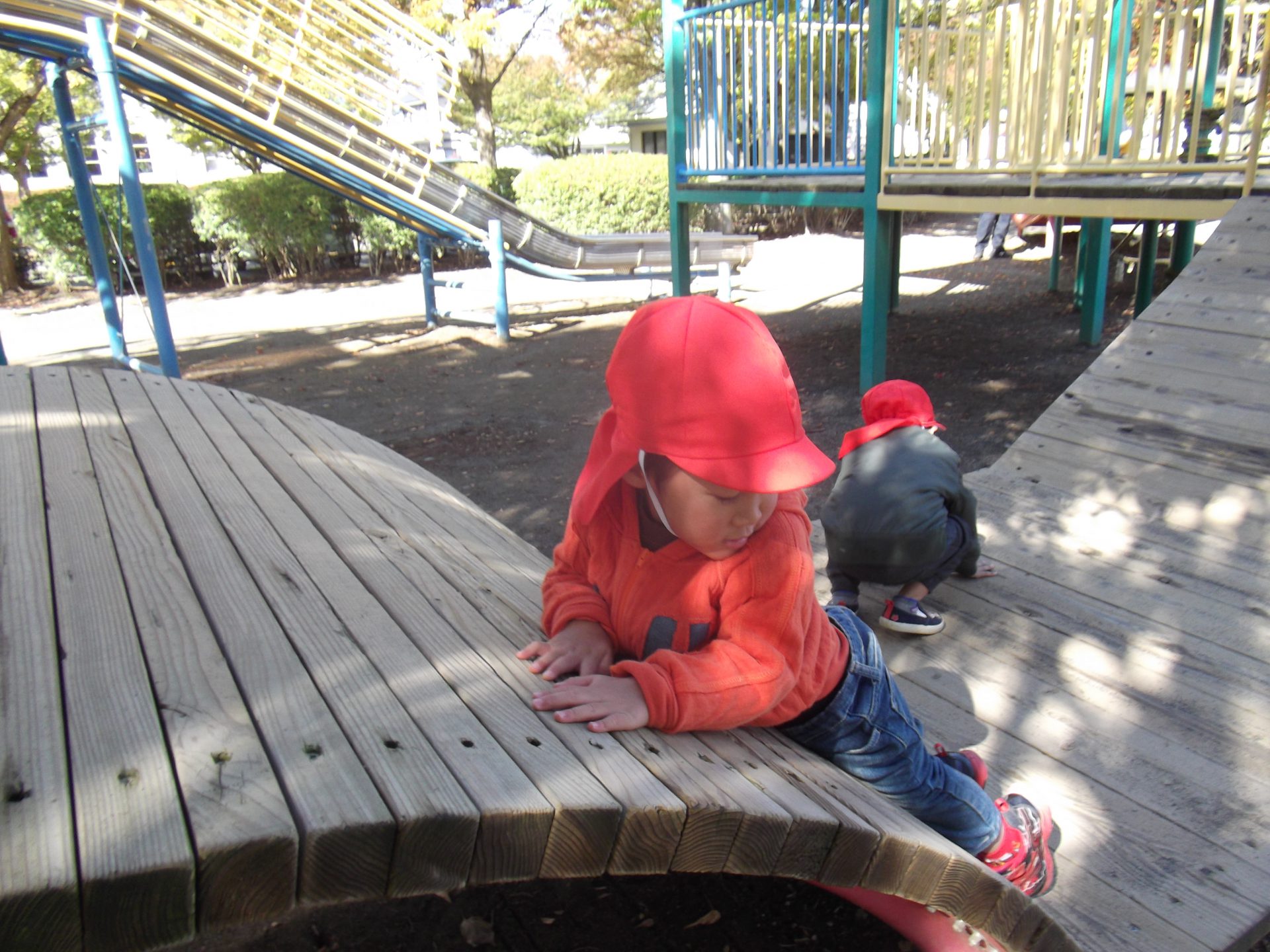 天気のいい日に、大きな公園でゆっくり遊べたらと思い、出かけてきました。公園についたころには日差しも暖かく、子どもたちも元気いっぱい遊ぶ姿が見られました。公園の中には、紅葉が始まって色づいた葉もあり、それを一生懸命に集める子や、「どんぐりあった!」と見せてくれる子、遊具で夢中になって遊ぶ子…様々な姿が見られました。沢山遊んでおなかも空いたのか、お弁当もよく食べ、お昼寝もぐっすりの子どもたちでした。また、天気のいい日にはどこか出かけて、自然の変化を楽しめたらと思っています。