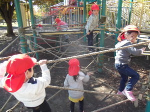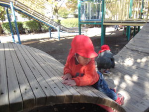 沢山の大きな遊具で楽しそうに遊んだり、ドングリを見つけたり、黄色や茶色の葉を見つけて保育者に見せてくれる子どももいました。少しずつ秋が深まっている様子を、肌で感じることができた年少組の子どもたちでした。