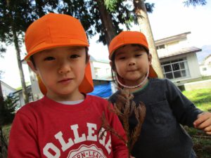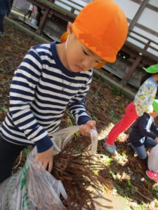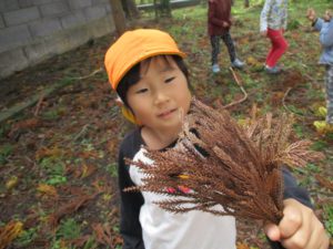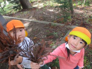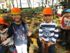 ずっと前から楽しみにしていた子どもたち。先週は、やきいも会で燃やす杉の葉を探しに出かけました。近くの諏訪神社には杉の葉がたくさん!しかし、緑色、黄色、オレンジ色、茶色・・・同じ杉の葉でもいろいろな色をしています。