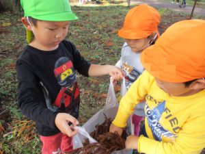 「やきいも会で使うよく燃える葉は“茶色の葉っぱだよ」と教えてもらうと、子どもたちは「これ茶色だ!」「これは緑だからダメダメ!」「これはどっちかなぁ~?」と友達同士で考えたり相談したりしながら集めていました。