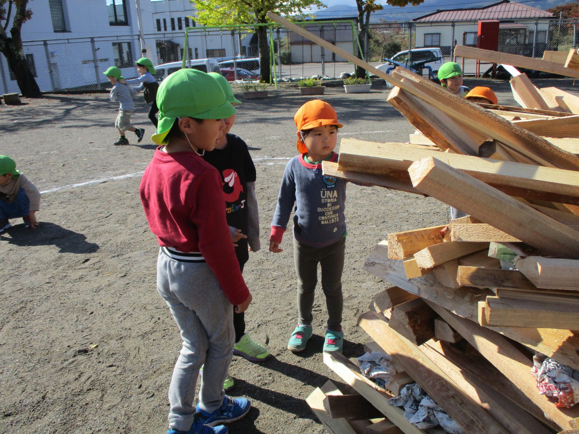待ちにまったやきいも会。この日に向けて杉の葉を拾ったり、薪を組んだり子ども達も参加し準備をしてきました。よく燃える葉はどんな葉っぱだろう?と友達同士で話し合ったり、保育士に聞いたりしていました。間近で見る機会が少ないたき火を子ども達はまじまじと見て、煙の様子や燃え上がっていく様子などひとつひとつの変化を楽しみながら見ていました。間近でたき火を見たり、焼き芋の匂いを嗅いだり、味わったりして、五感を使って楽しさを友達と共有できたことは、貴重な経験だったのではないかと思います。一人ひとりが思ったことや感じたことを大切に子ども達同士で自由に発信し合っていけたらと思います。