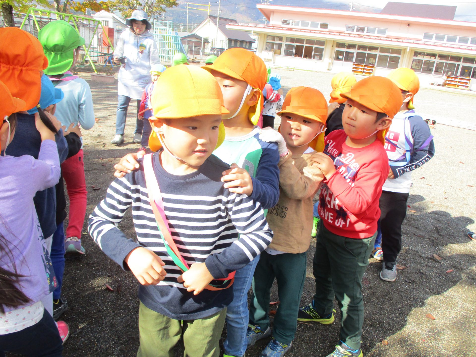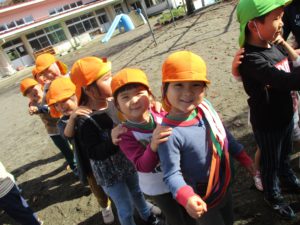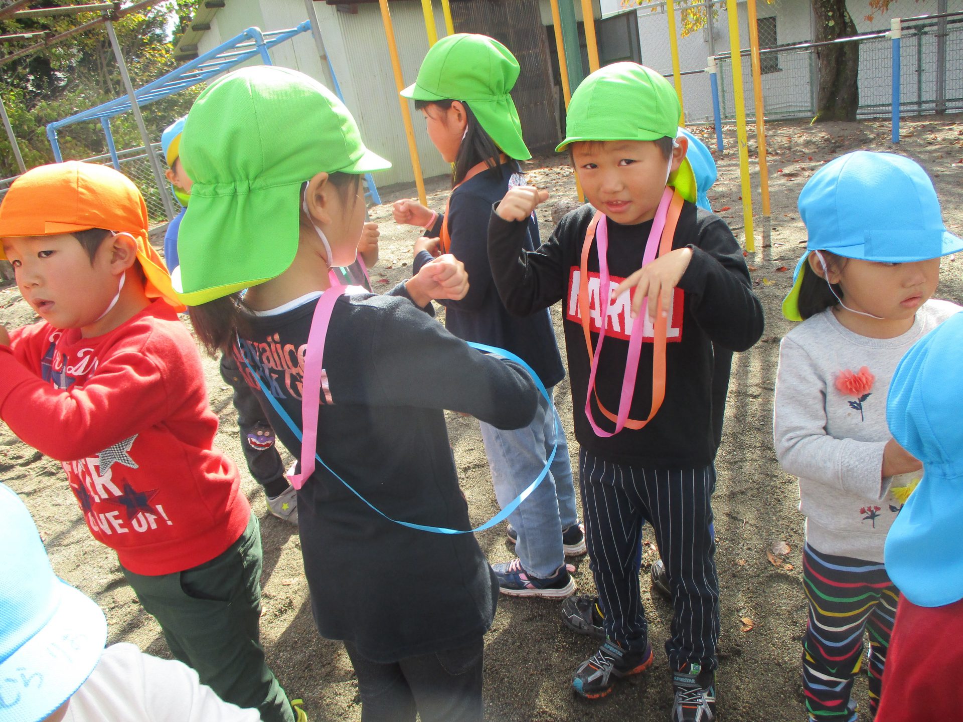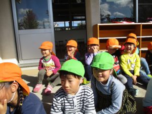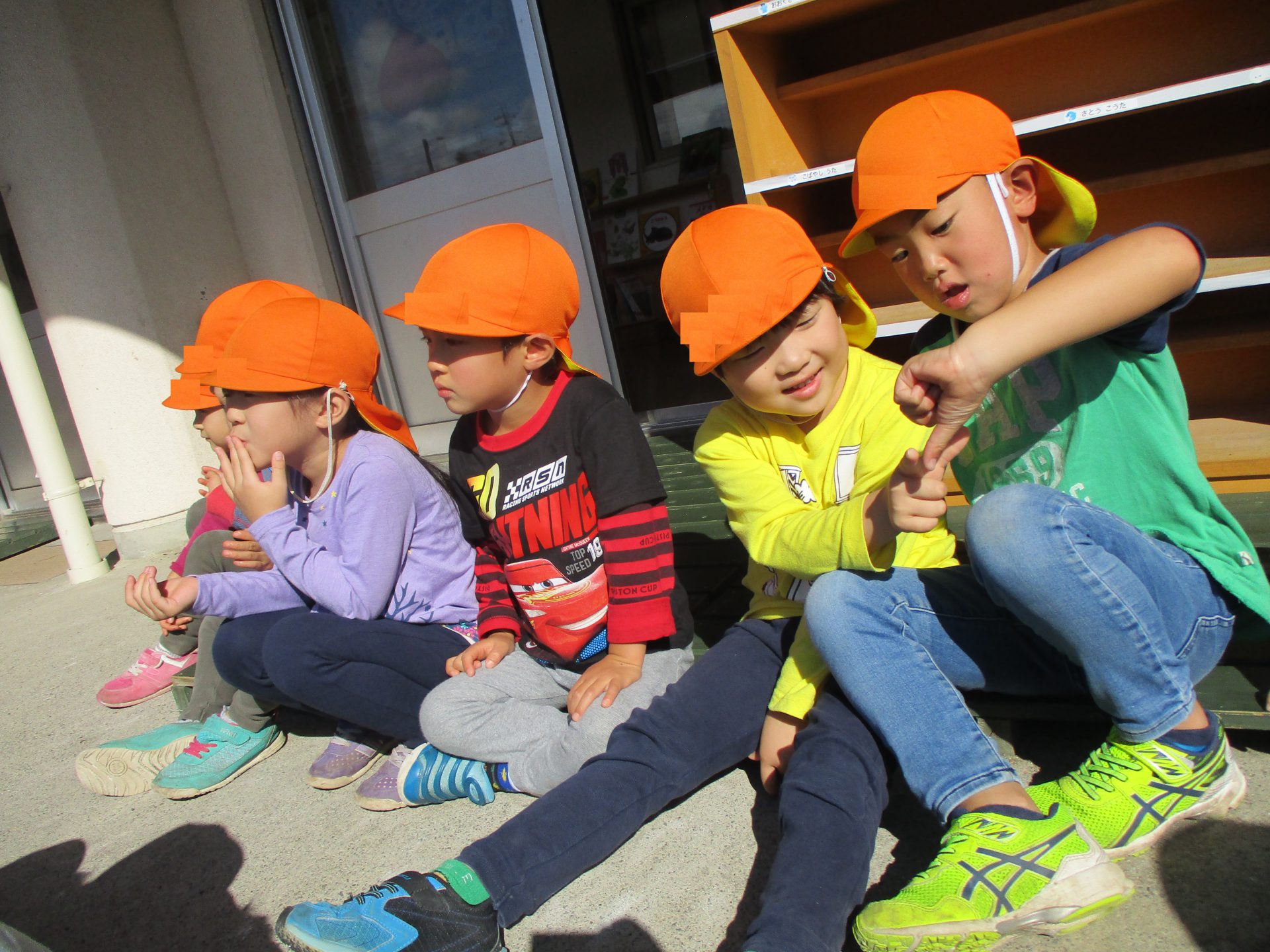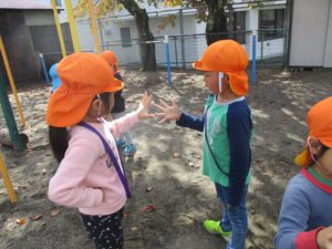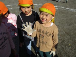 火がおきになるまで、やきいもグーチーパーで遊びました。年少さんとペアになった年長さんは目線の高さを低くして話しかけたり、手をつないで一緒に移動したり、優しい姿に年少さんも安心です♪